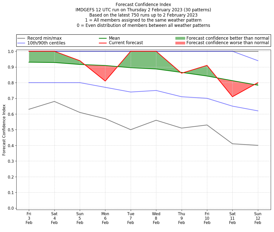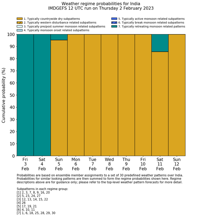 | Weather patterns typically associated with contrywide dry period tendencies over India are most likely Weather patterns 2, 3, 7, 8, 9, 16 and 20 (countrywide winter dry period) | |