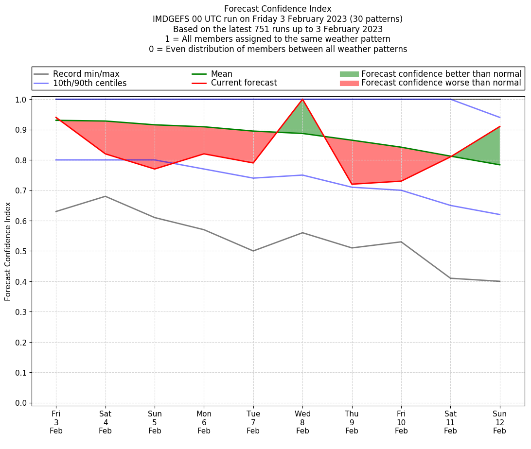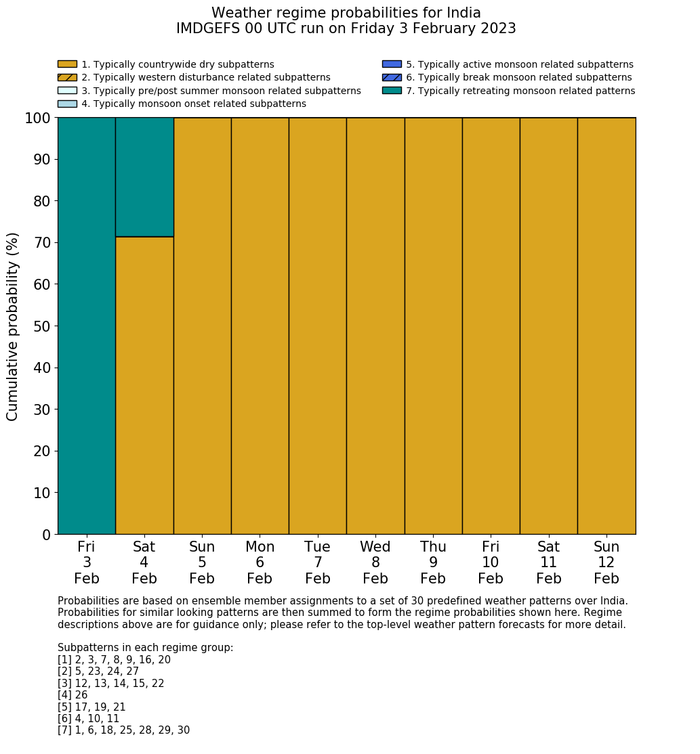 | Weather patterns typically associated with contrywide dry period tendencies over India are most likely Weather patterns 2, 3, 7, 8, 9, 16 and 20 (countrywide winter dry period) | |
