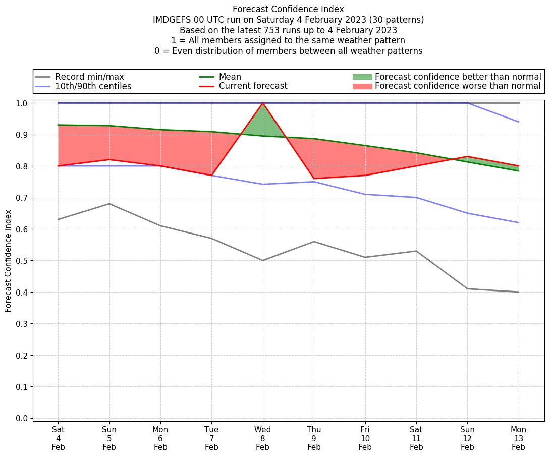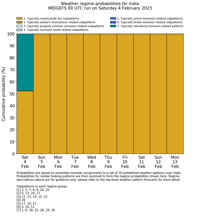 | Weather patterns typically associated with contrywide dry period tendencies over India are most likely Weather patterns 2, 3, 7, 8, 9, 16 and 20 (countrywide winter dry period) | |