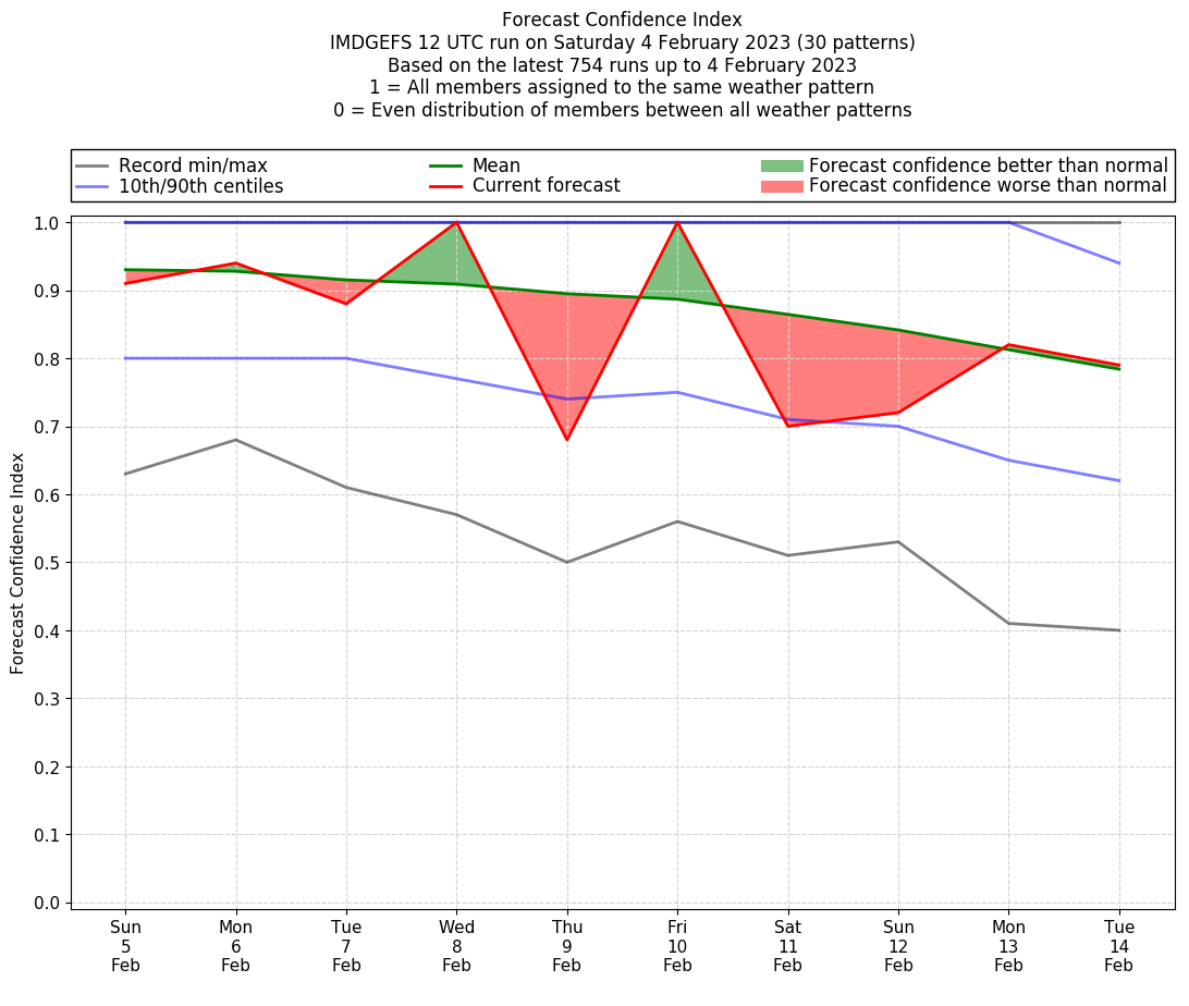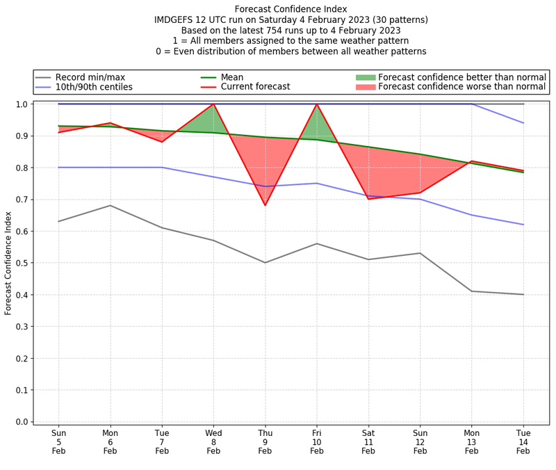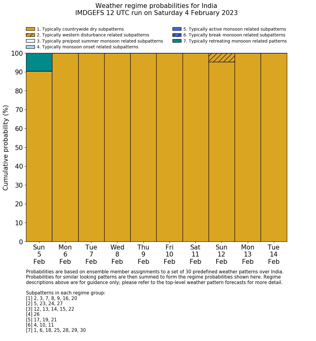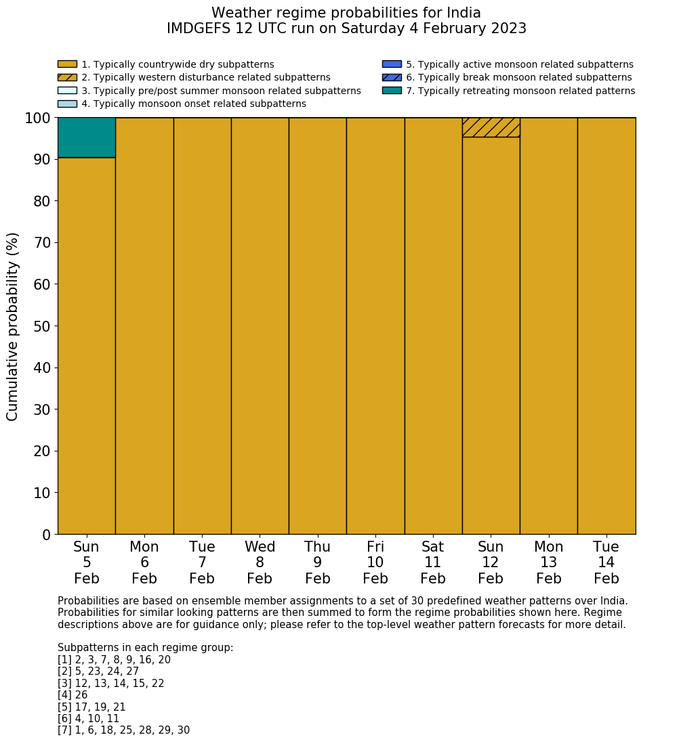 | Weather patterns typically associated with contrywide dry period tendencies over India are most likely Weather patterns 2, 3, 7, 8, 9, 16 and 20 (countrywide winter dry period) | |