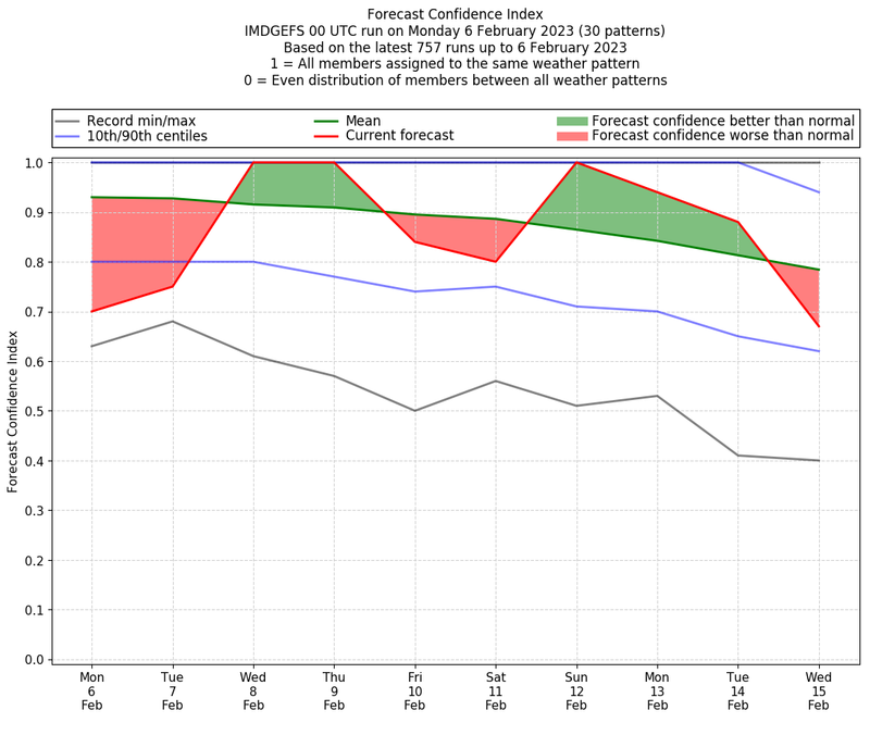 | Weather patterns typically associated with contrywide dry period tendencies over India are most likely Weather patterns 2, 3, 7, 8, 9, 16 and 20 (countrywide winter dry period) | |