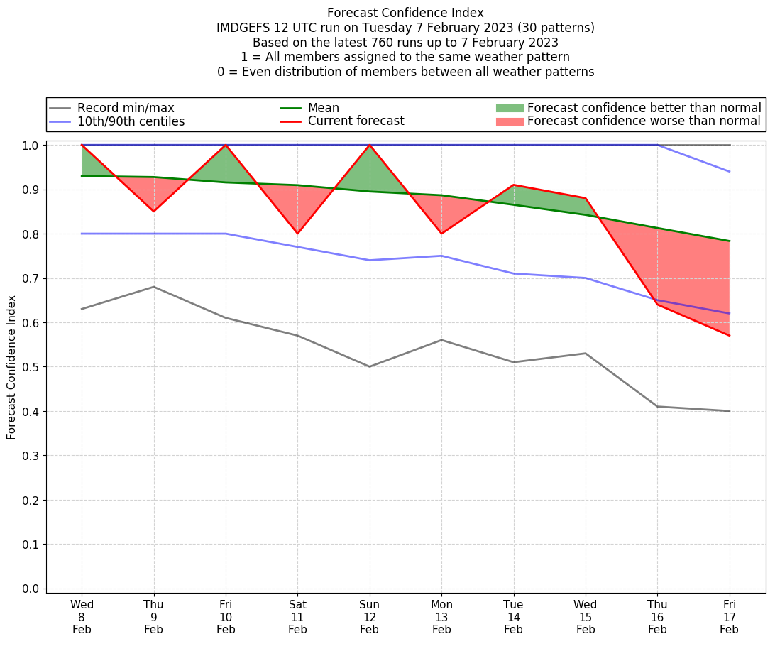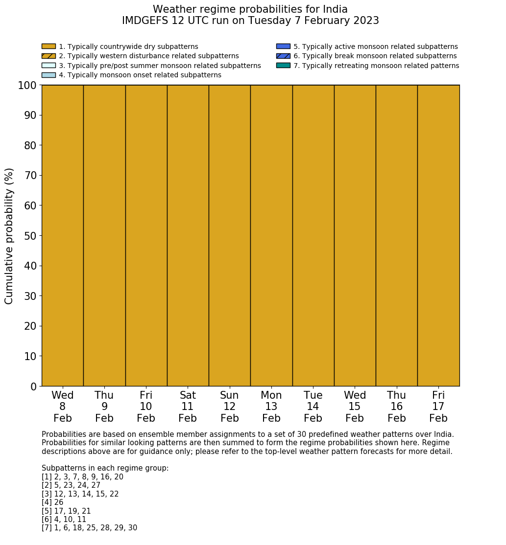 | Weather patterns typically associated with contrywide dry period tendencies over India are most likely Weather patterns 2, 3, 7, 8, 9, 16 and 20 (countrywide winter dry period) | |
