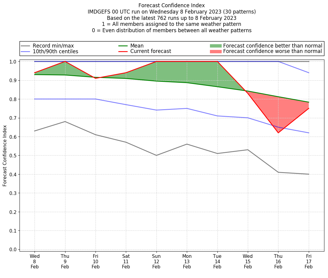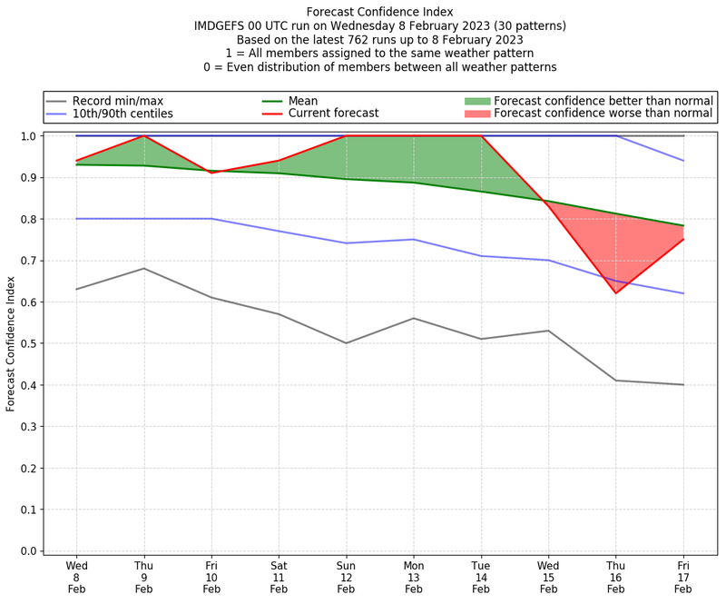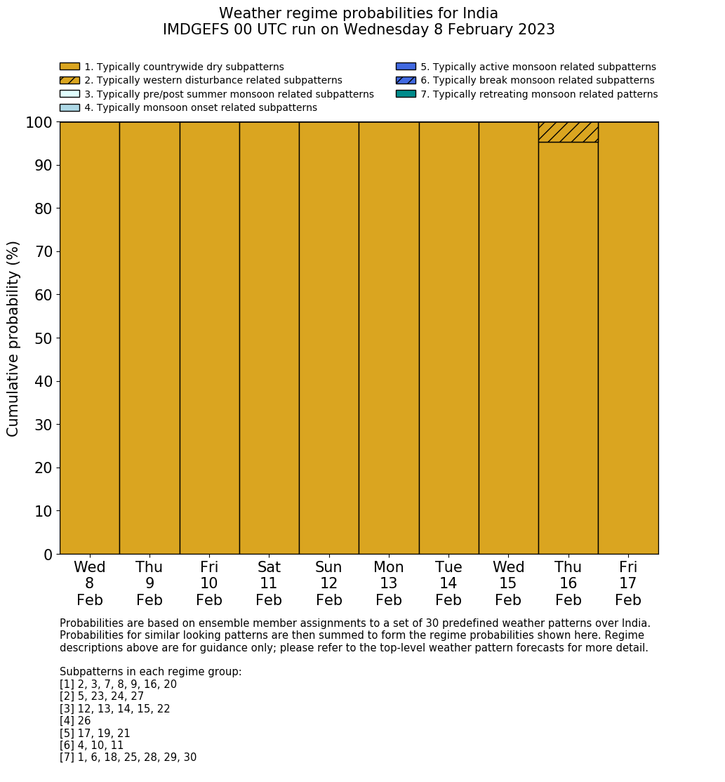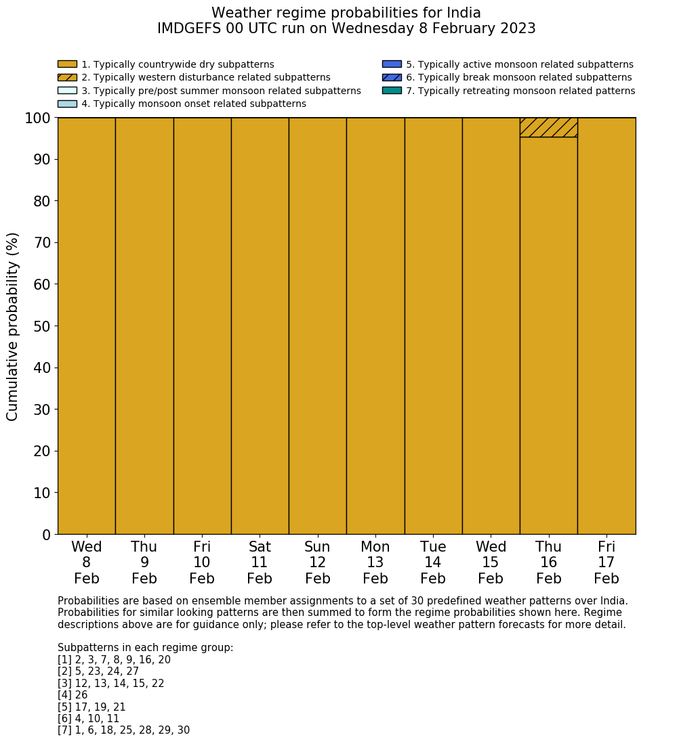 | Weather patterns typically associated with contrywide dry period tendencies over India are most likely Weather patterns 2, 3, 7, 8, 9, 16 and 20 (countrywide winter dry period) | |