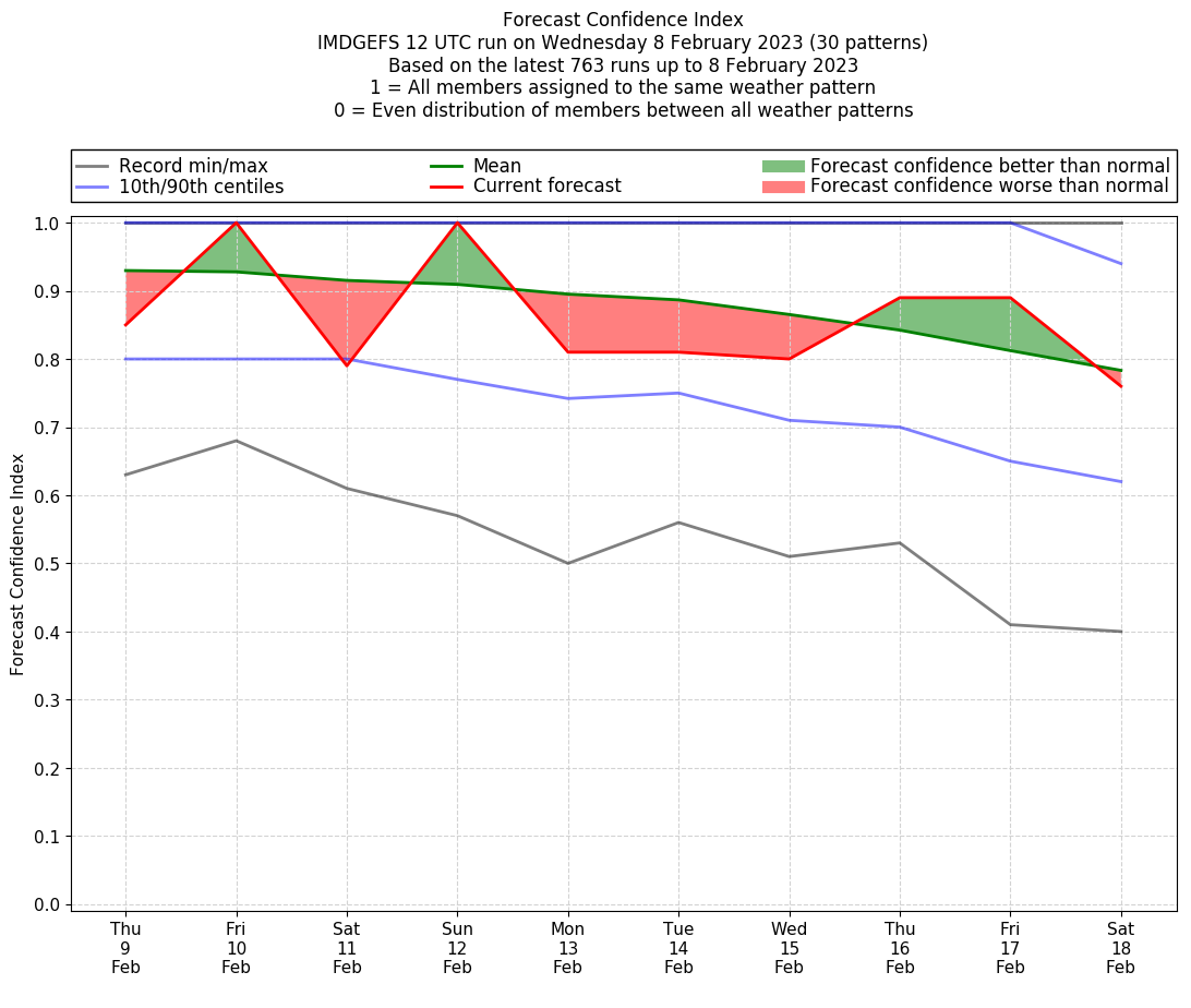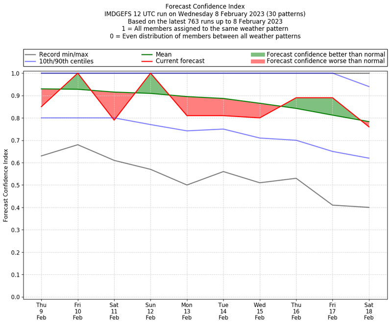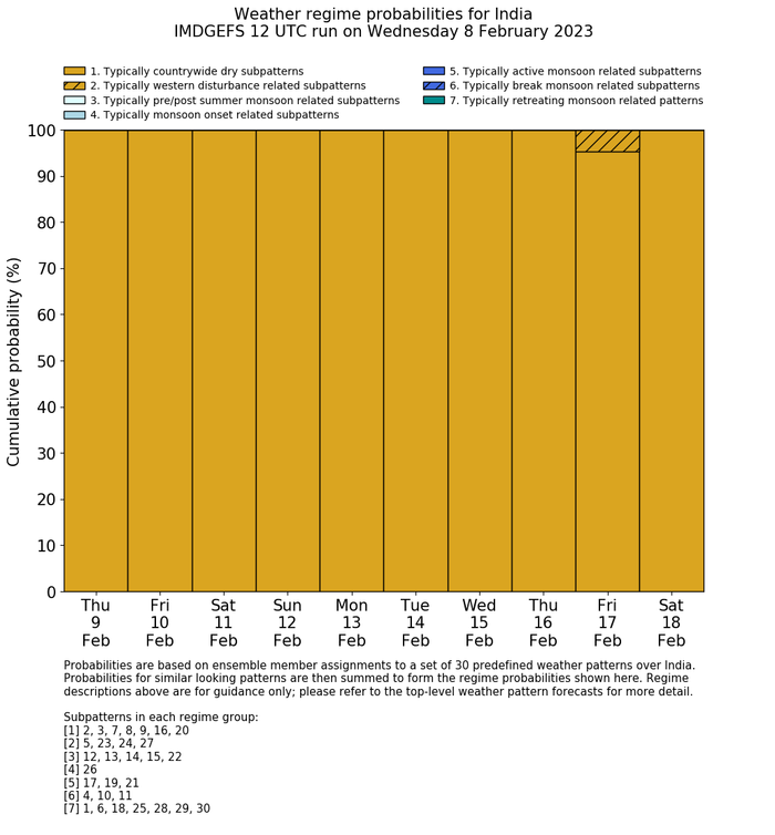 | Weather patterns typically associated with contrywide dry period tendencies over India are most likely Weather patterns 2, 3, 7, 8, 9, 16 and 20 (countrywide winter dry period) | |