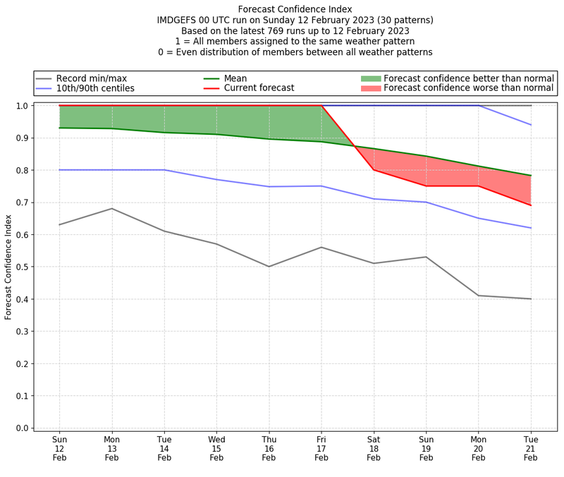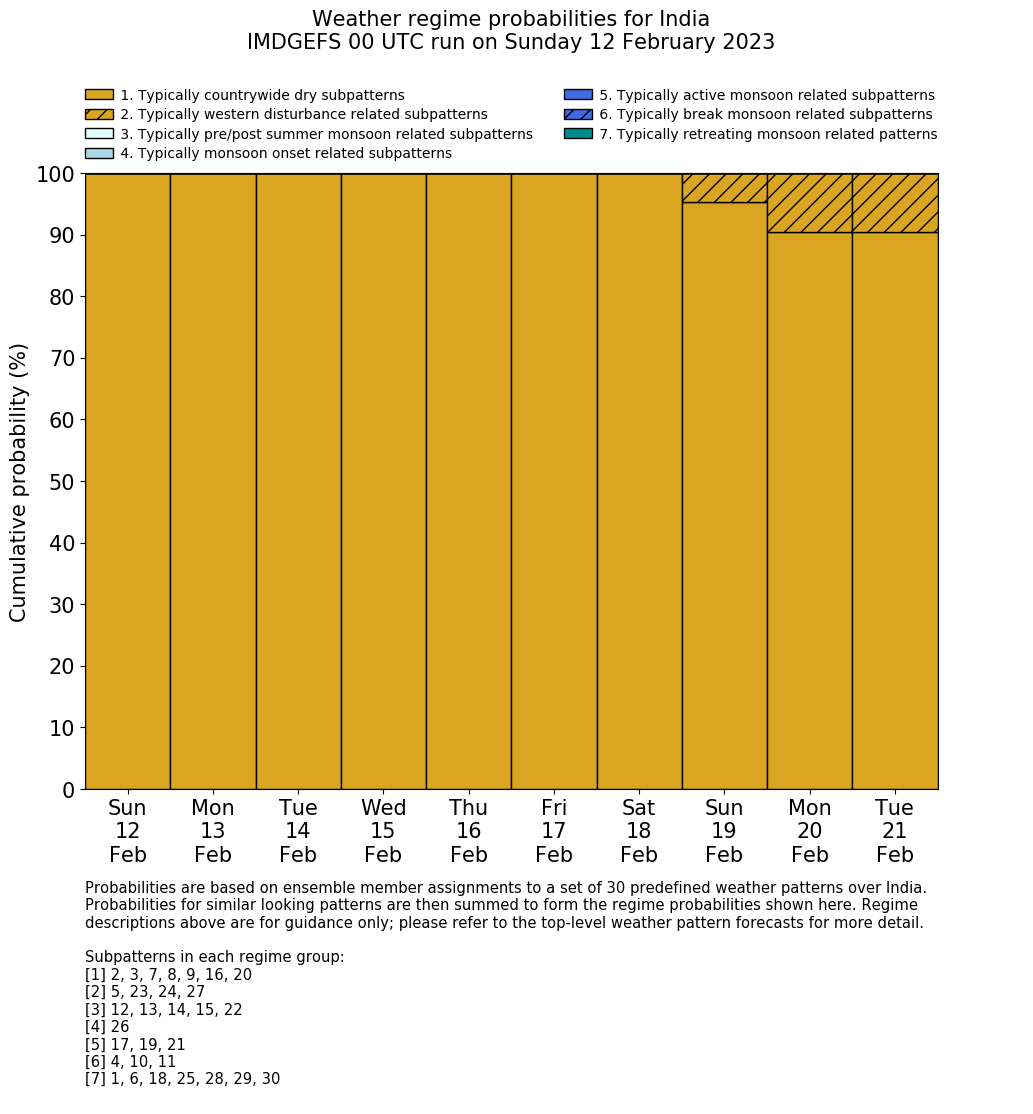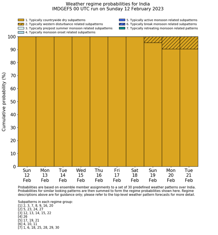 | Weather patterns typically associated with contrywide dry period tendencies over India are most likely Weather patterns 2, 3, 7, 8, 9, 16 and 20 (countrywide winter dry period) | |