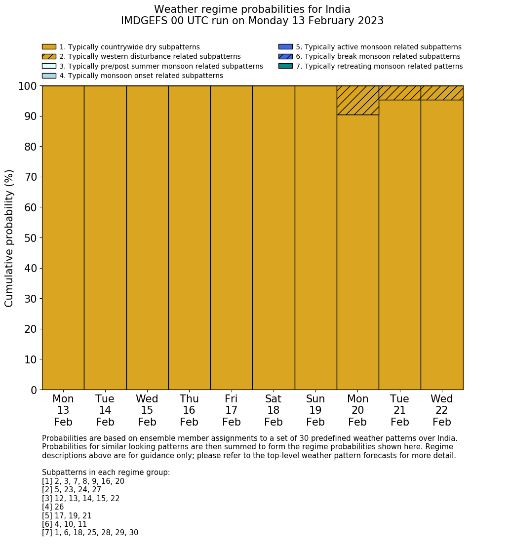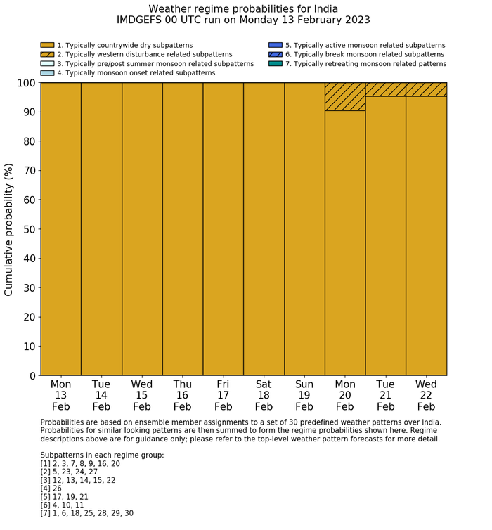 | Weather patterns typically associated with contrywide dry period tendencies over India are most likely Weather patterns 2, 3, 7, 8, 9, 16 and 20 (countrywide winter dry period) | |