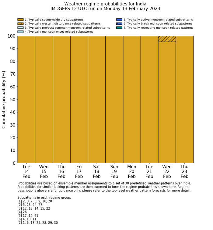 | Weather patterns typically associated with contrywide dry period tendencies over India are most likely Weather patterns 2, 3, 7, 8, 9, 16 and 20 (countrywide winter dry period) | |