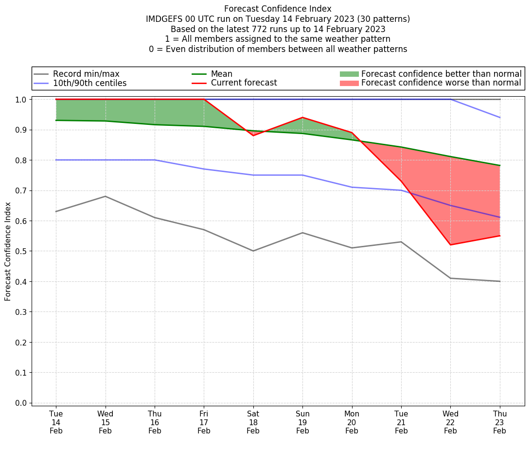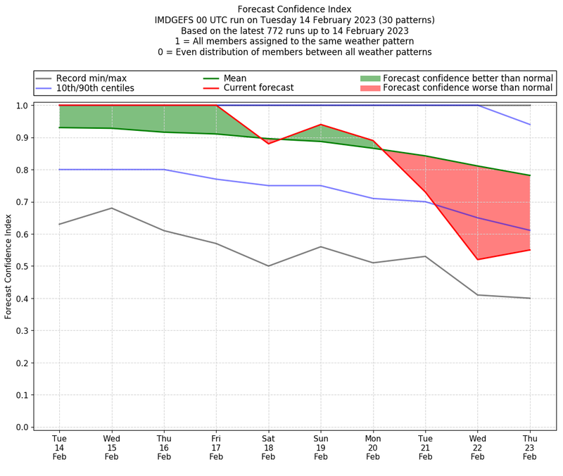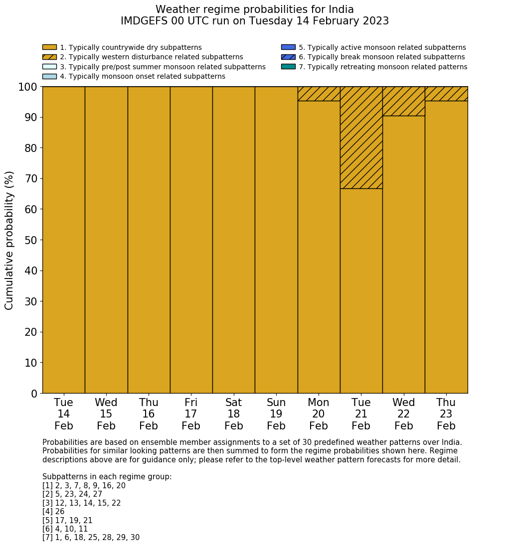 | Weather patterns typically associated with contrywide dry period tendencies over India are most likely Weather patterns 2, 3, 7, 8, 9, 16 and 20 (countrywide winter dry period) | |