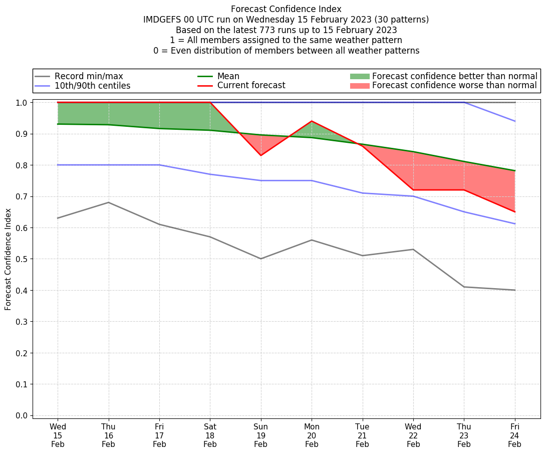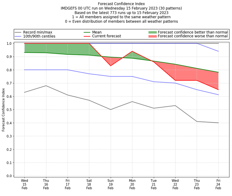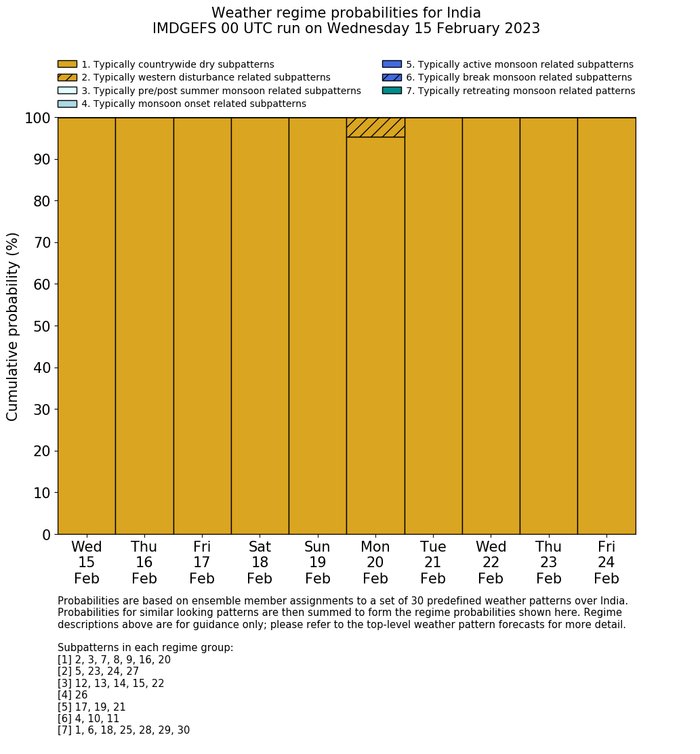 | Weather patterns typically associated with contrywide dry period tendencies over India are most likely Weather patterns 2, 3, 7, 8, 9, 16 and 20 (countrywide winter dry period) | |