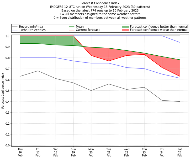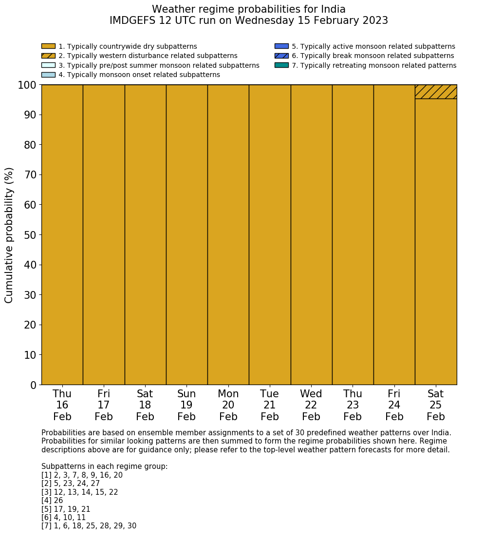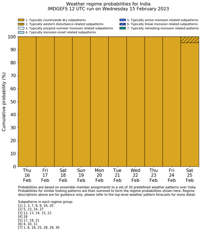 | Weather patterns typically associated with contrywide dry period tendencies over India are most likely Weather patterns 2, 3, 7, 8, 9, 16 and 20 (countrywide winter dry period) | |