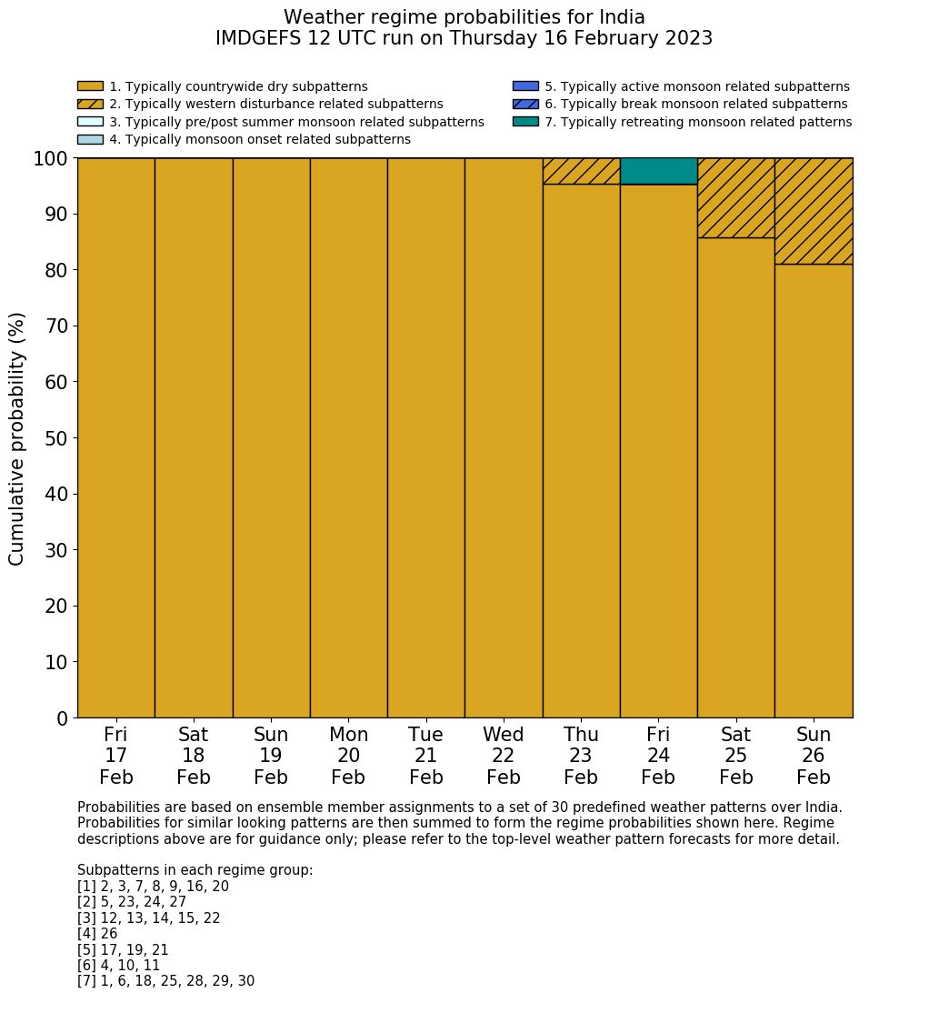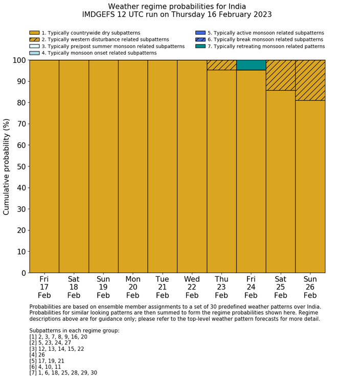 | Weather patterns typically associated with contrywide dry period tendencies over India are most likely Weather patterns 2, 3, 7, 8, 9, 16 and 20 (countrywide winter dry period) | |