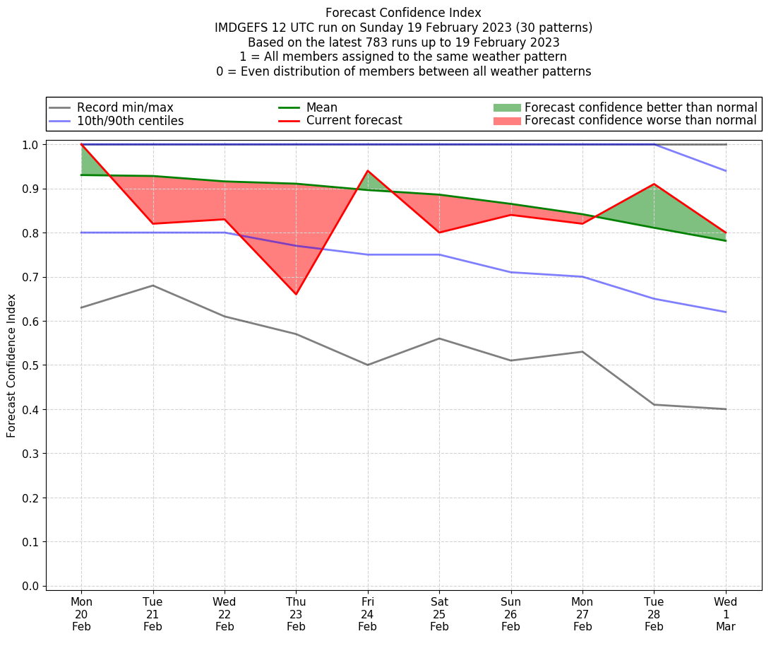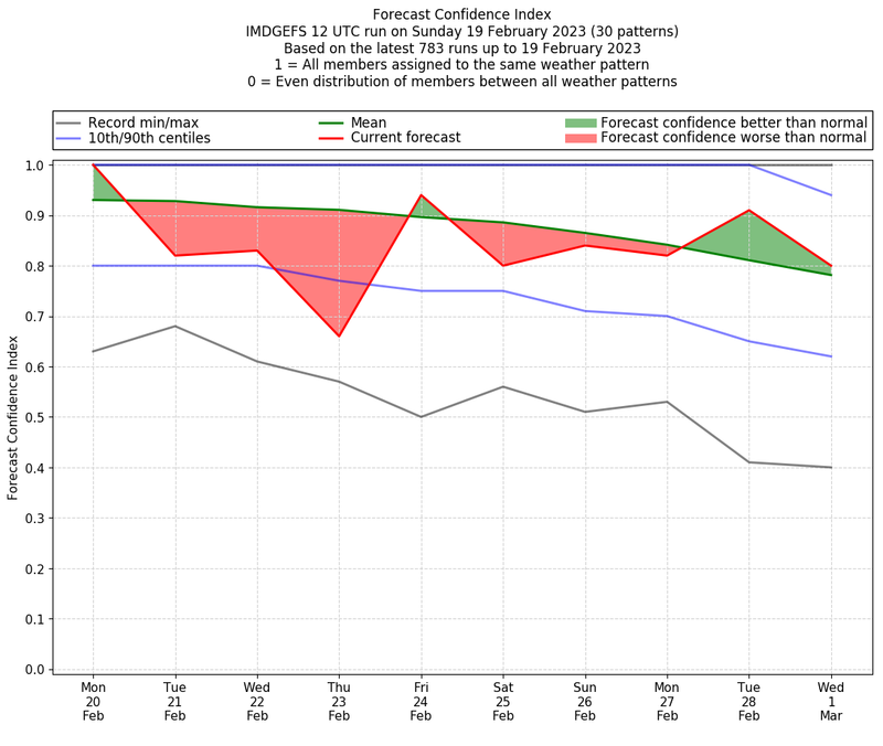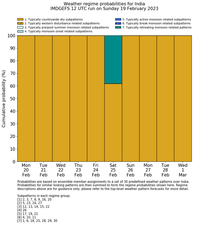 | Weather patterns typically associated with contrywide dry period tendencies over India are most likely Weather patterns 2, 3, 7, 8, 9, 16 and 20 (countrywide winter dry period) | |