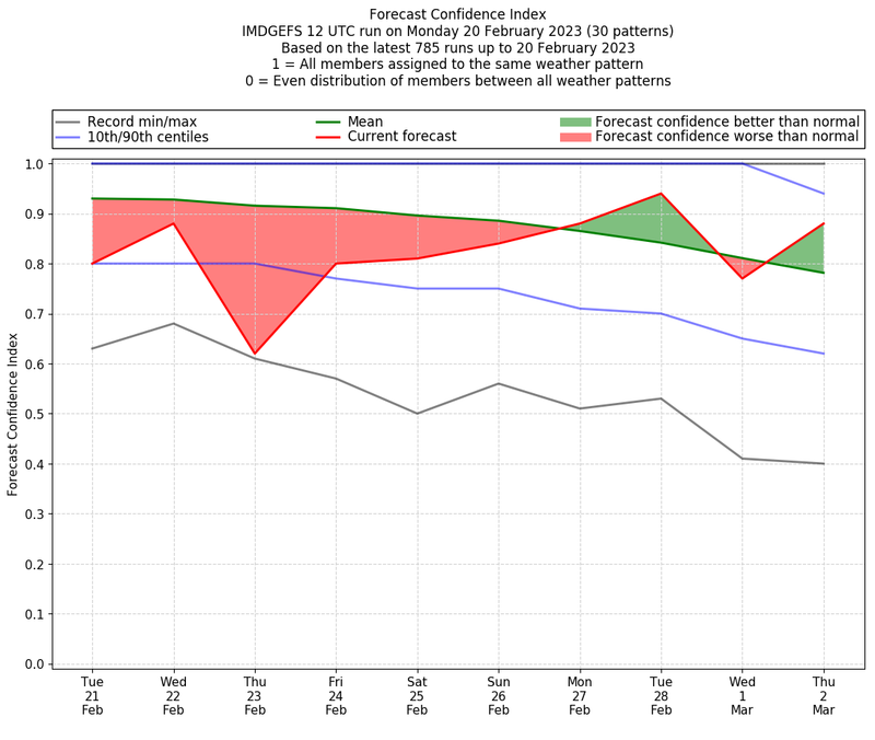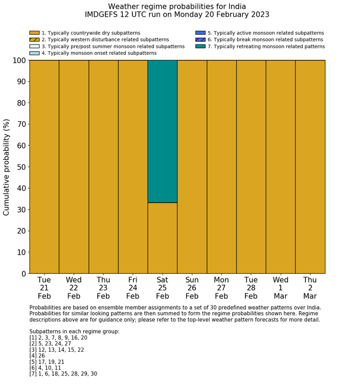 | Weather patterns typically associated with contrywide dry period tendencies over India are most likely Weather patterns 2, 3, 7, 8, 9, 16 and 20 (countrywide winter dry period) | |