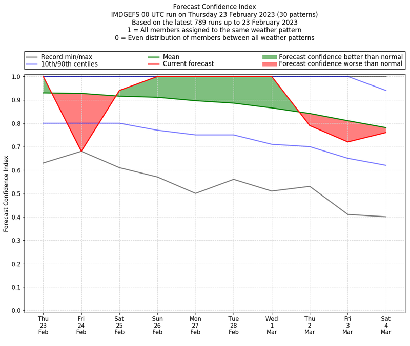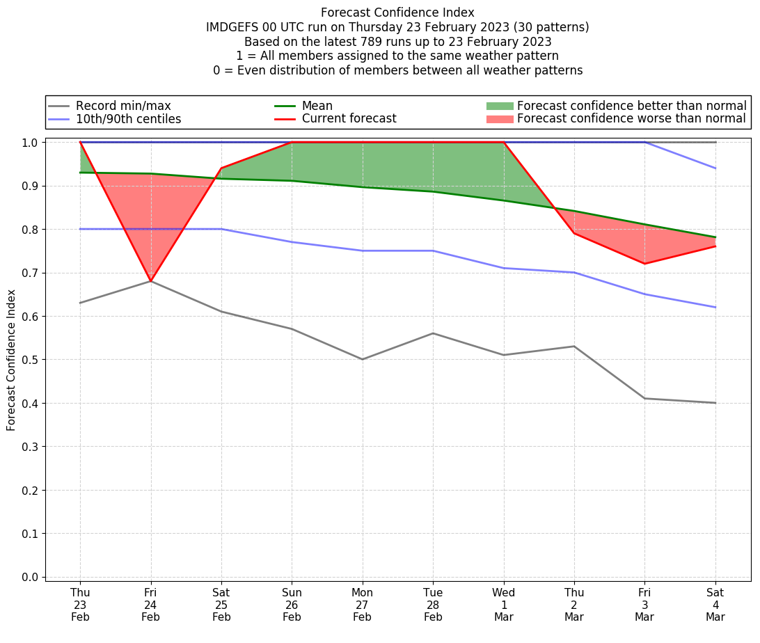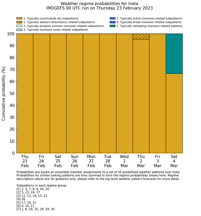 | Weather patterns typically associated with contrywide dry period tendencies over India are most likely Weather patterns 2, 3, 7, 8, 9, 16 and 20 (countrywide winter dry period) | |