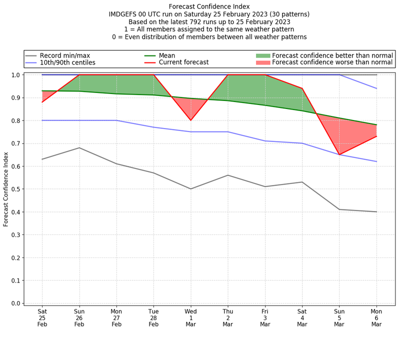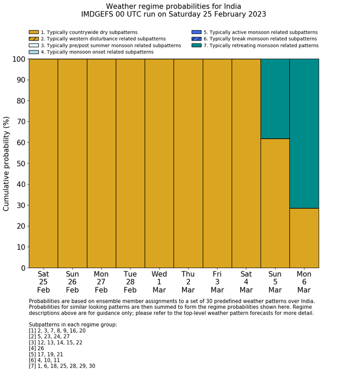 | Weather patterns typically associated with contrywide dry period tendencies over India are most likely Weather patterns 2, 3, 7, 8, 9, 16 and 20 (countrywide winter dry period) | |