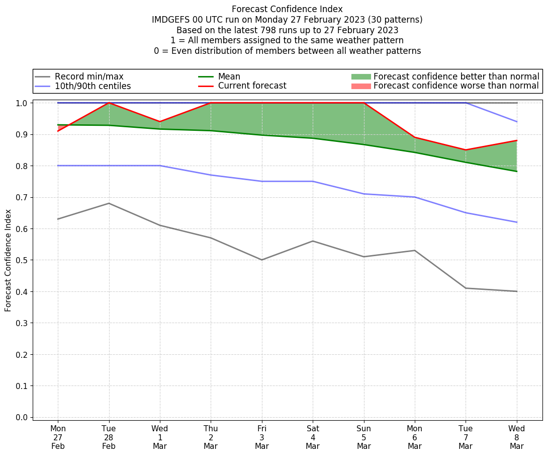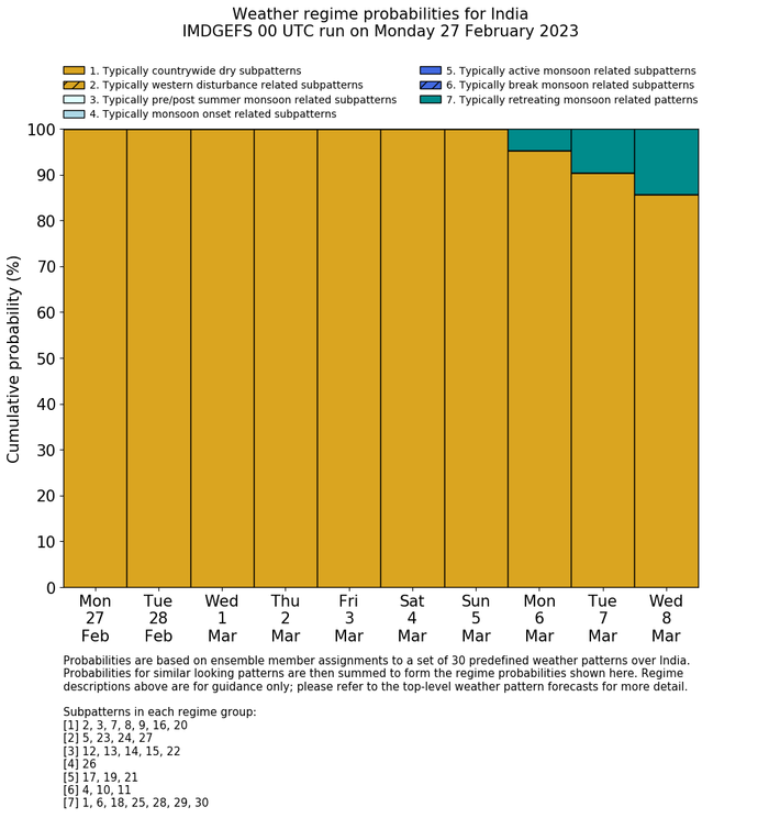 | Weather patterns typically associated with contrywide dry period tendencies over India are most likely Weather patterns 2, 3, 7, 8, 9, 16 and 20 (countrywide winter dry period) | |