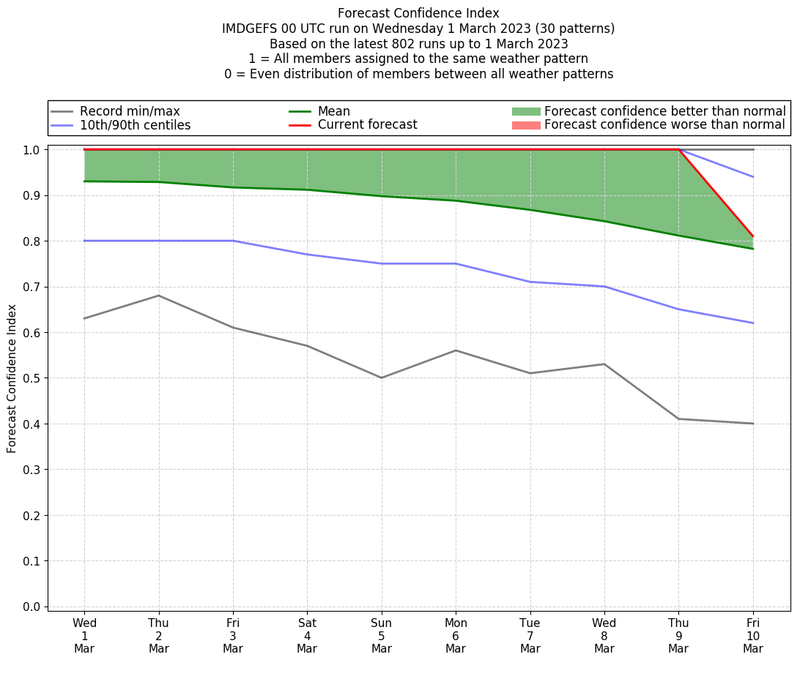 | Weather patterns typically associated with contrywide dry period tendencies over India are most likely Weather patterns 2, 3, 7, 8, 9, 16 and 20 (countrywide winter dry period) | |