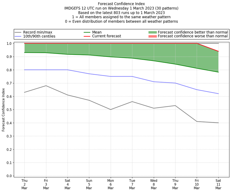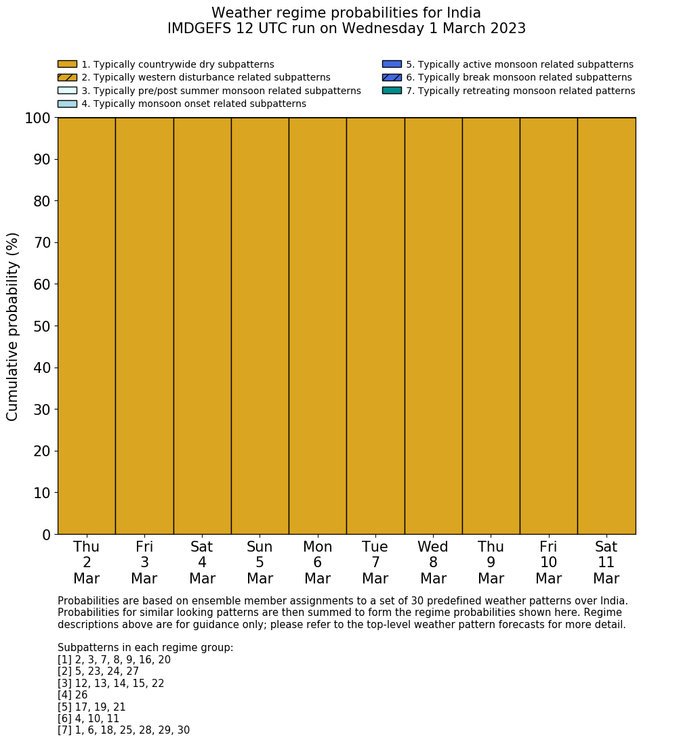 | Weather patterns typically associated with contrywide dry period tendencies over India are most likely Weather patterns 2, 3, 7, 8, 9, 16 and 20 (countrywide winter dry period) | |