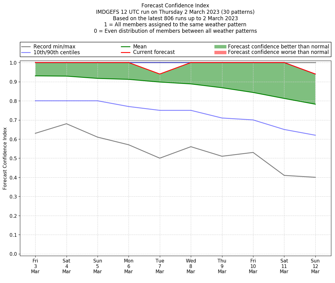 | Weather patterns typically associated with contrywide dry period tendencies over India are most likely Weather patterns 2, 3, 7, 8, 9, 16 and 20 (countrywide winter dry period) | |
