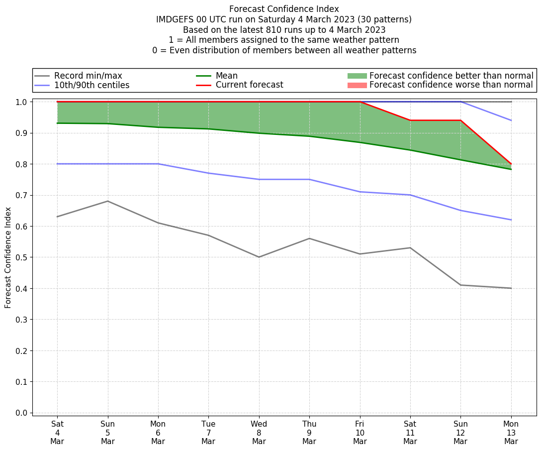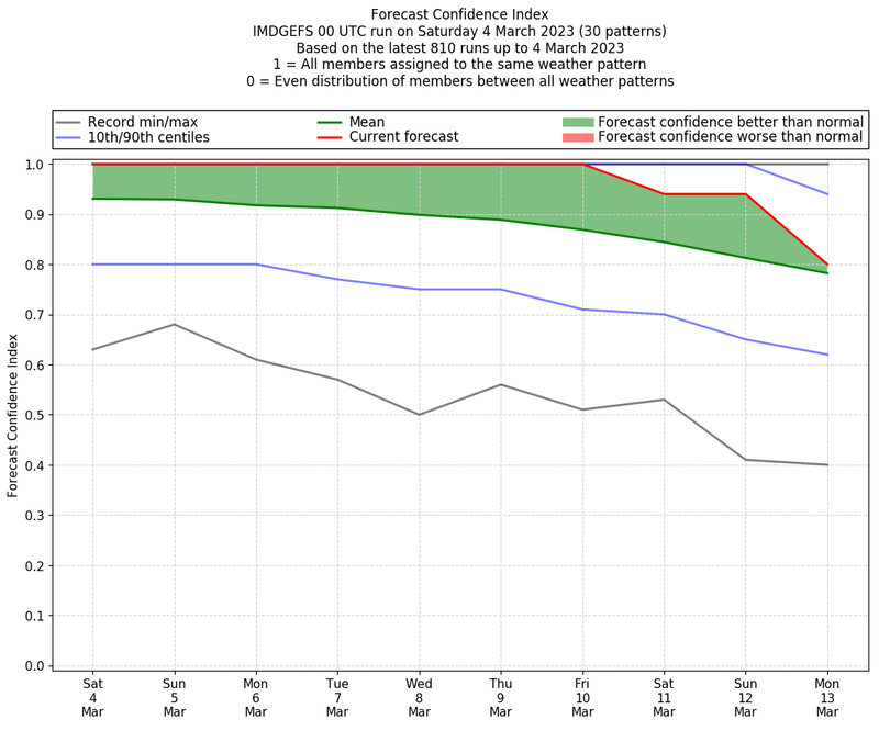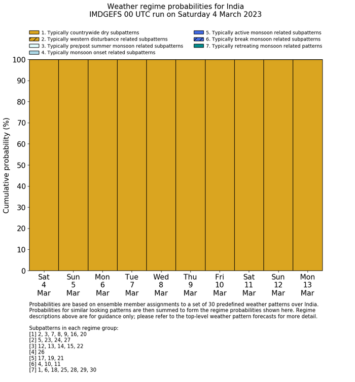 | Weather patterns typically associated with contrywide dry period tendencies over India are most likely Weather patterns 2, 3, 7, 8, 9, 16 and 20 (countrywide winter dry period) | |