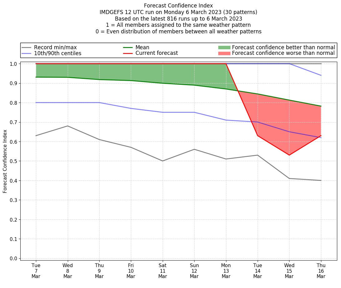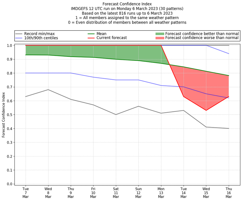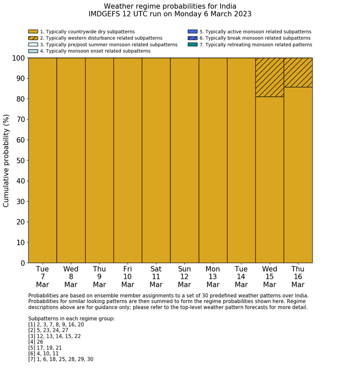 | Weather patterns typically associated with contrywide dry period tendencies over India are most likely Weather patterns 2, 3, 7, 8, 9, 16 and 20 (countrywide winter dry period) | |