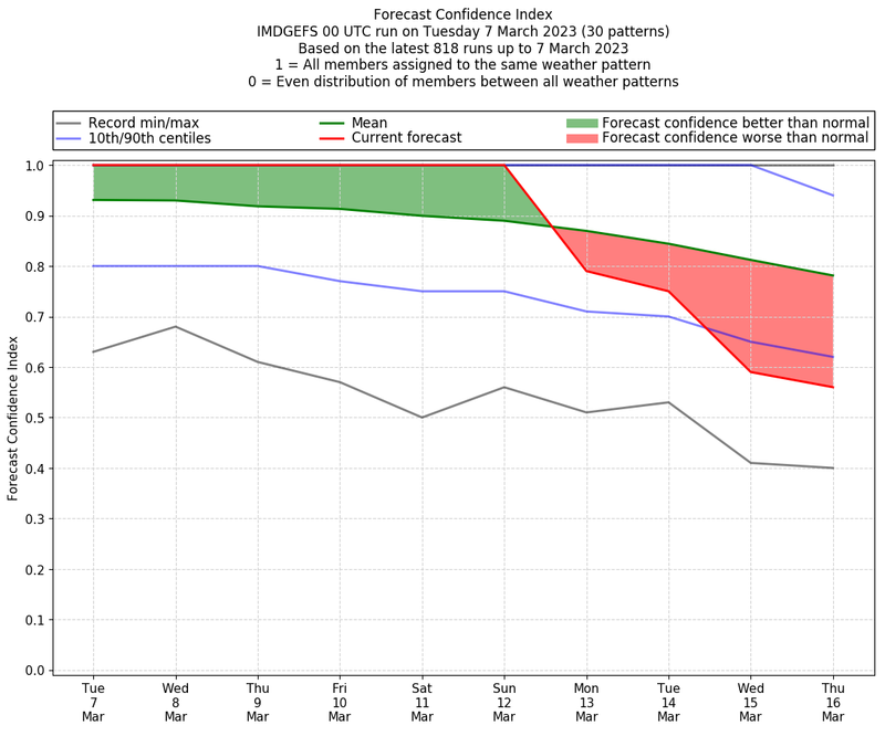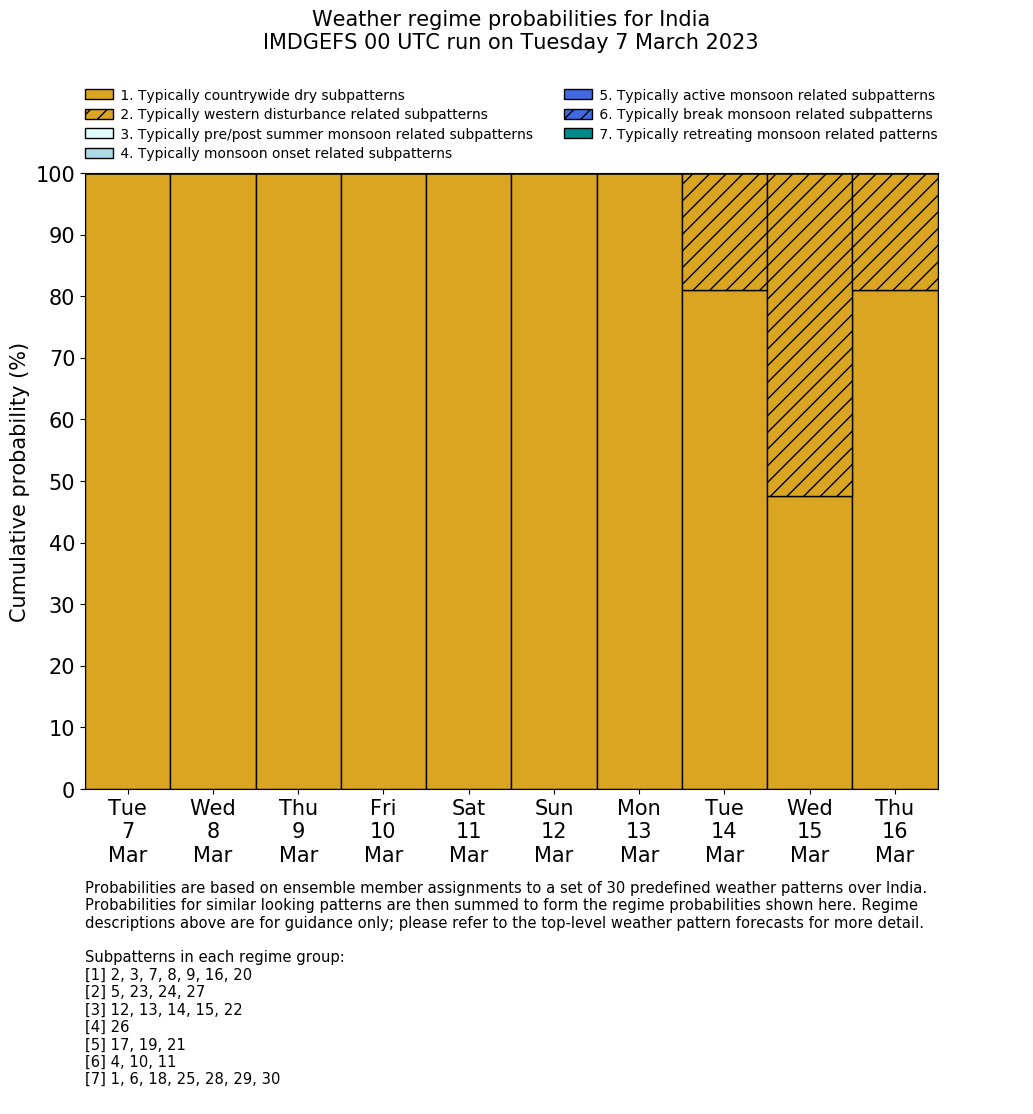 | Weather patterns typically associated with contrywide dry period tendencies over India are most likely Weather patterns 2, 3, 7, 8, 9, 16 and 20 (countrywide winter dry period) | |