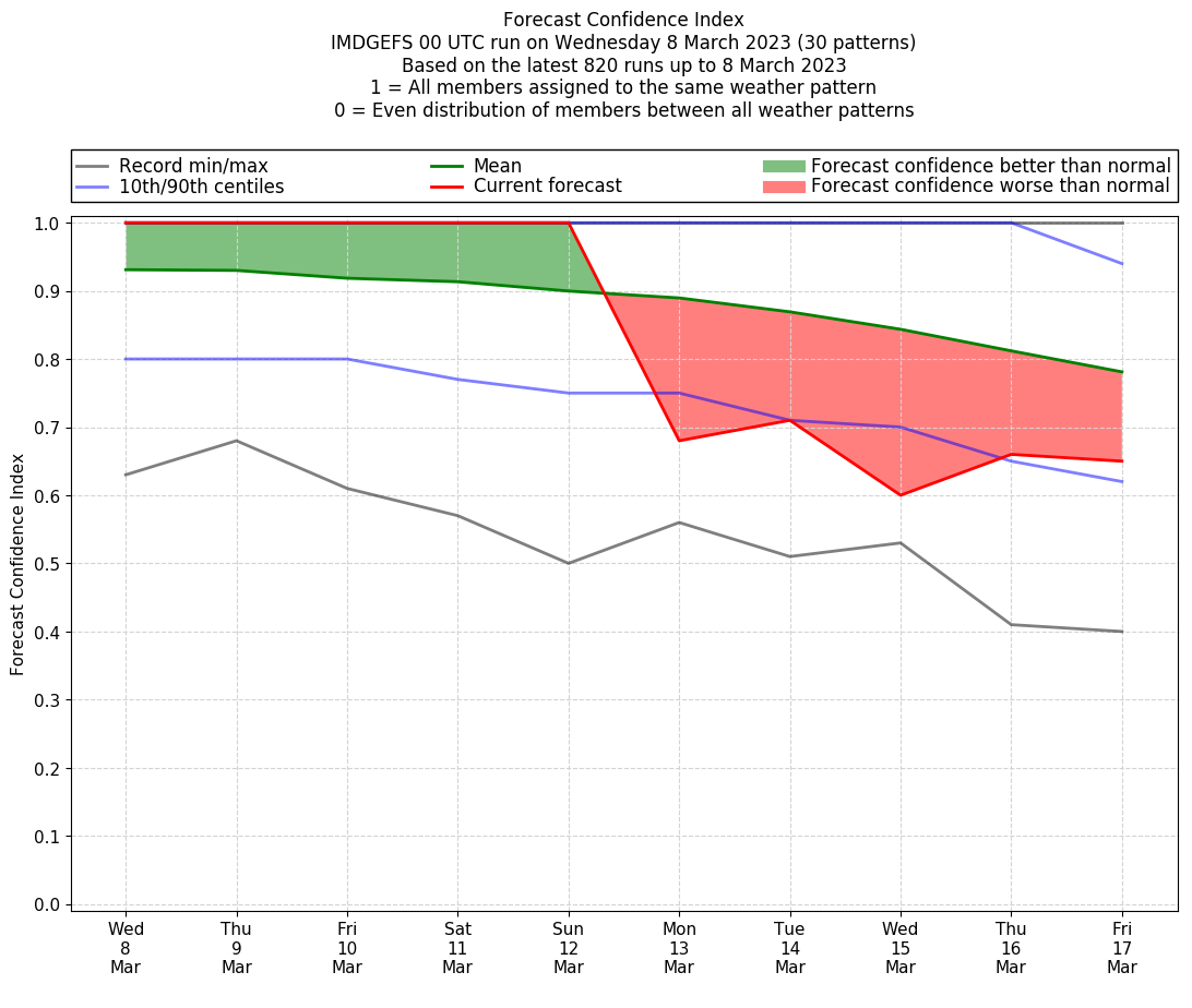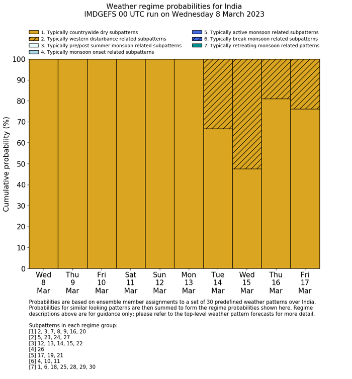 | Weather patterns typically associated with contrywide dry period tendencies over India are most likely Weather patterns 2, 3, 7, 8, 9, 16 and 20 (countrywide winter dry period) | |