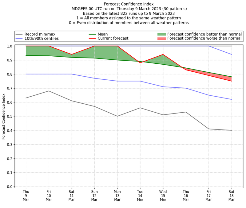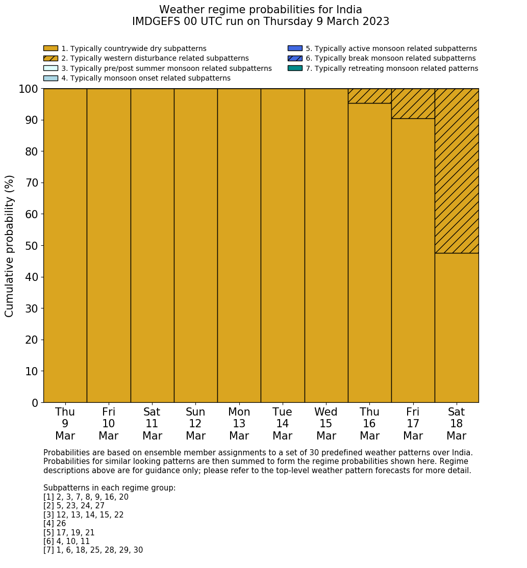 | Weather patterns typically associated with contrywide dry period tendencies over India are most likely Weather patterns 2, 3, 7, 8, 9, 16 and 20 (countrywide winter dry period) | |