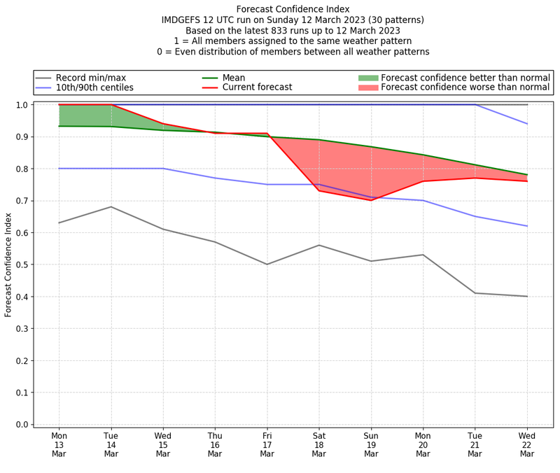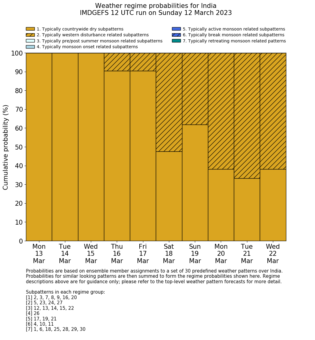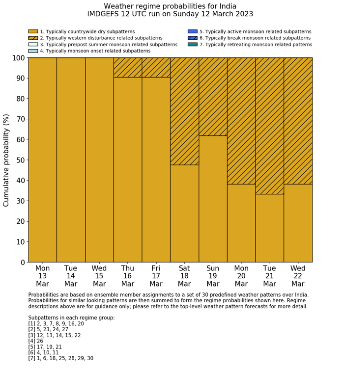 | Weather patterns typically associated with contrywide dry period tendencies over India are most likely Weather patterns 2, 3, 7, 8, 9, 16 and 20 (countrywide winter dry period) | |