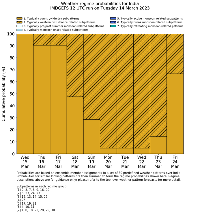| Weather patterns typically associated with contrywide dry period tendencies over India are most likely Weather patterns 2, 3, 7, 8, 9, 16 and 20 (countrywide winter dry period) | |