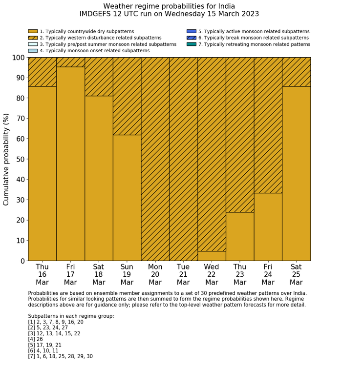 | Weather patterns typically associated with contrywide dry period tendencies over India are most likely Weather patterns 2, 3, 7, 8, 9, 16 and 20 (countrywide winter dry period) | |