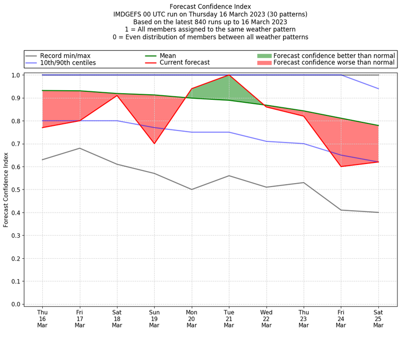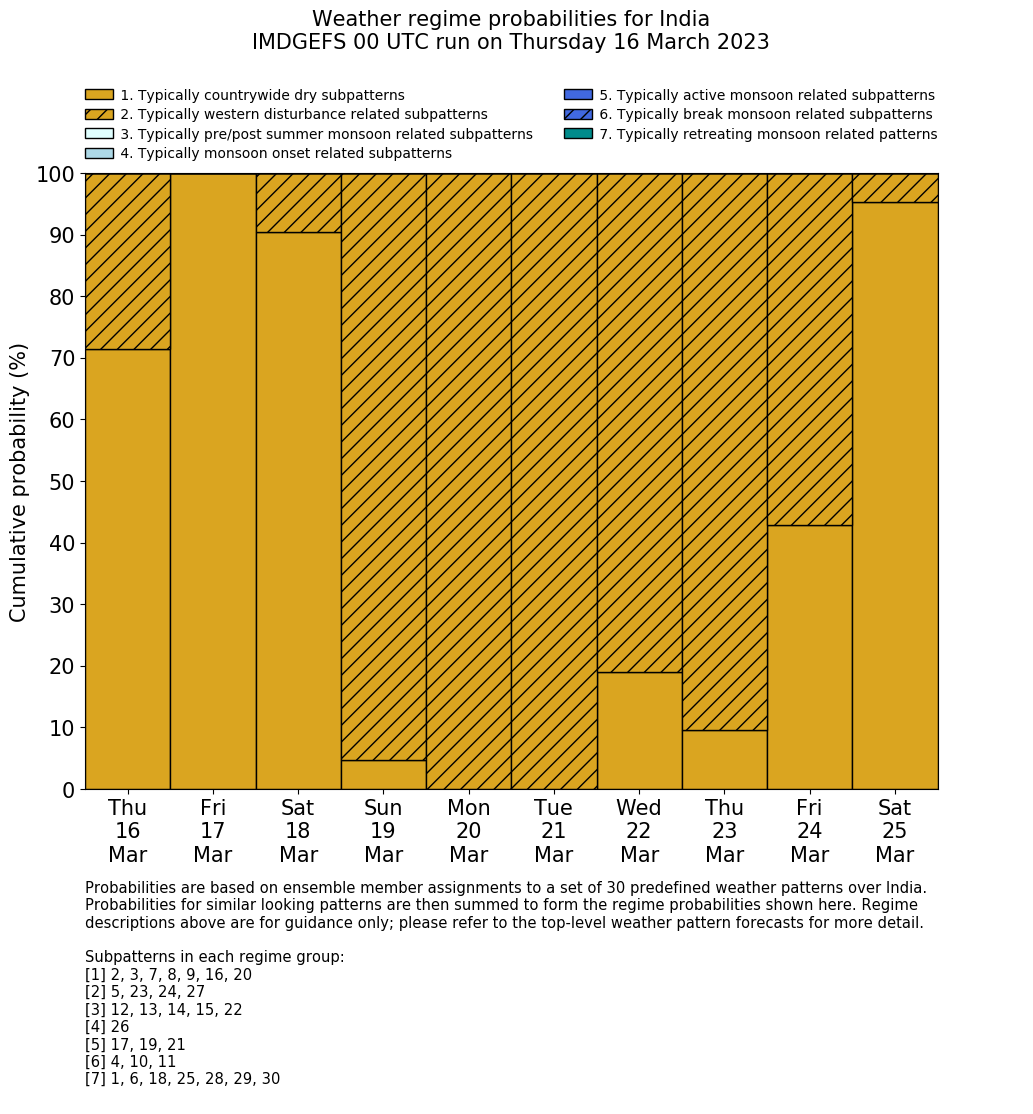 | Weather patterns typically associated with contrywide dry period tendencies over India are most likely Weather patterns 2, 3, 7, 8, 9, 16 and 20 (countrywide winter dry period) | |