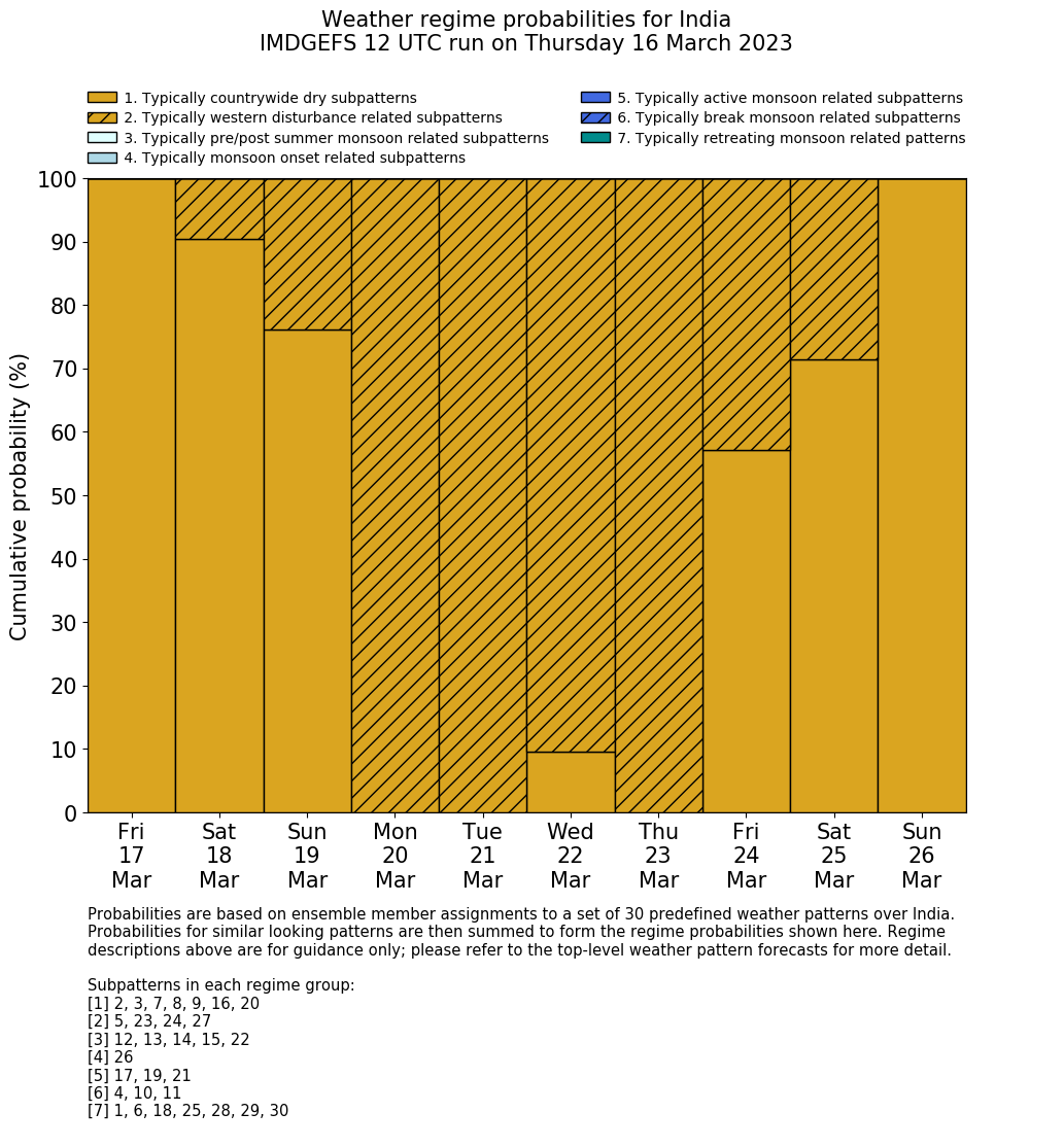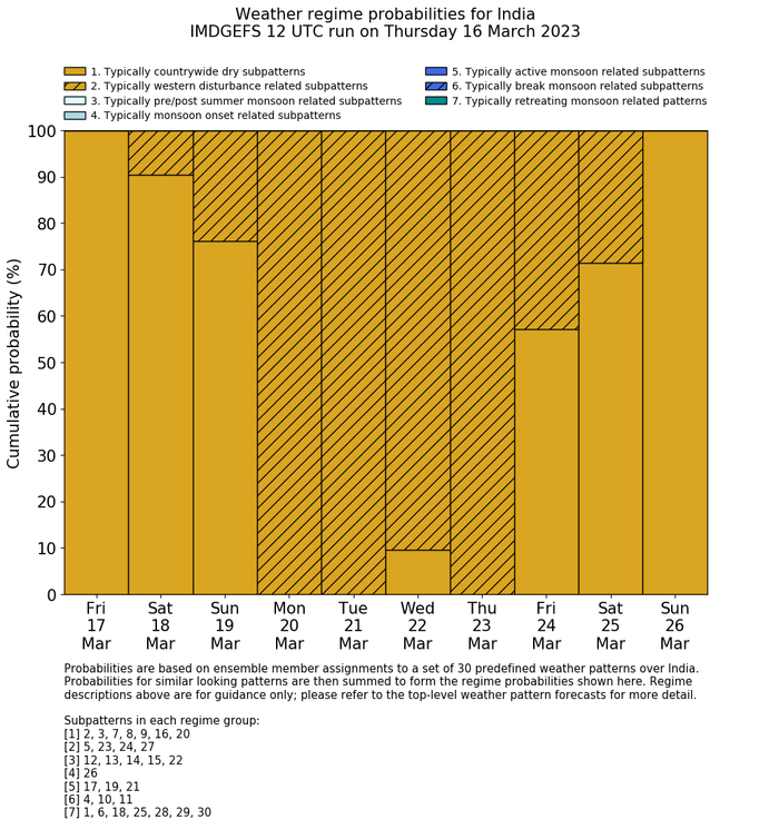 | Weather patterns typically associated with contrywide dry period tendencies over India are most likely Weather patterns 2, 3, 7, 8, 9, 16 and 20 (countrywide winter dry period) | |
