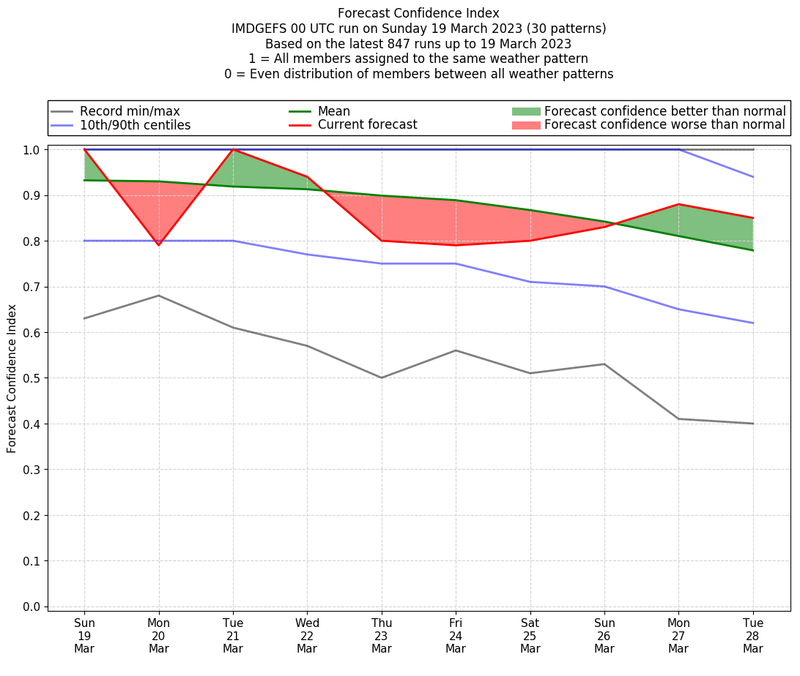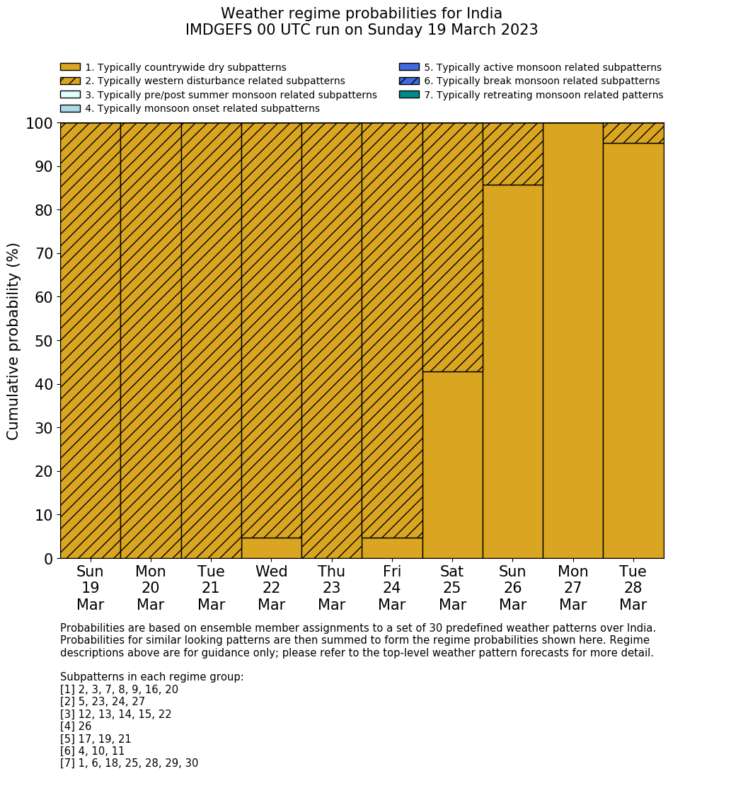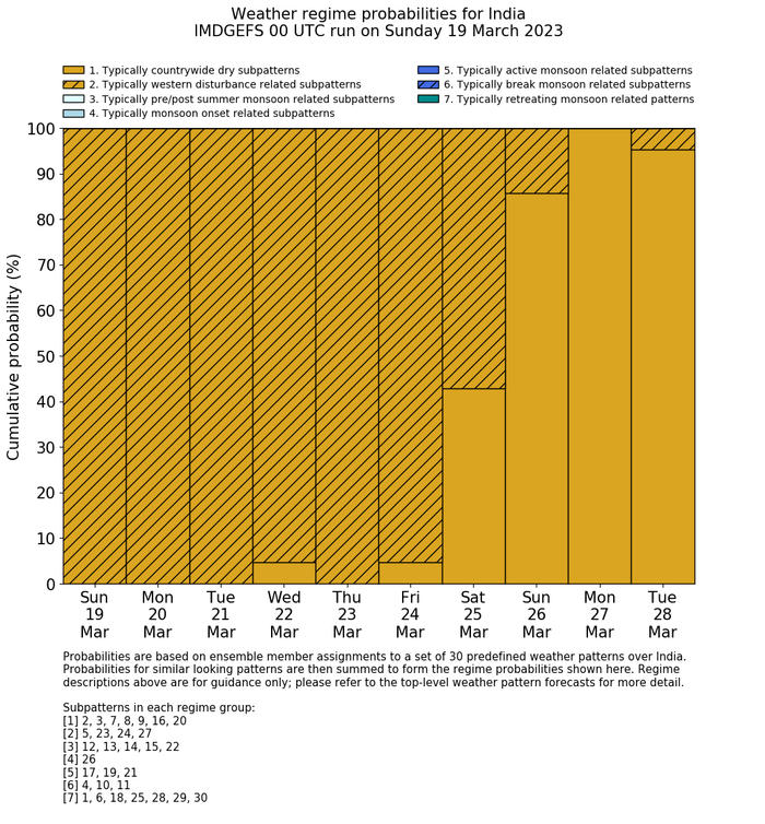 | Weather patterns typically associated with contrywide dry period tendencies over India are most likely Weather patterns 2, 3, 7, 8, 9, 16 and 20 (countrywide winter dry period) | |