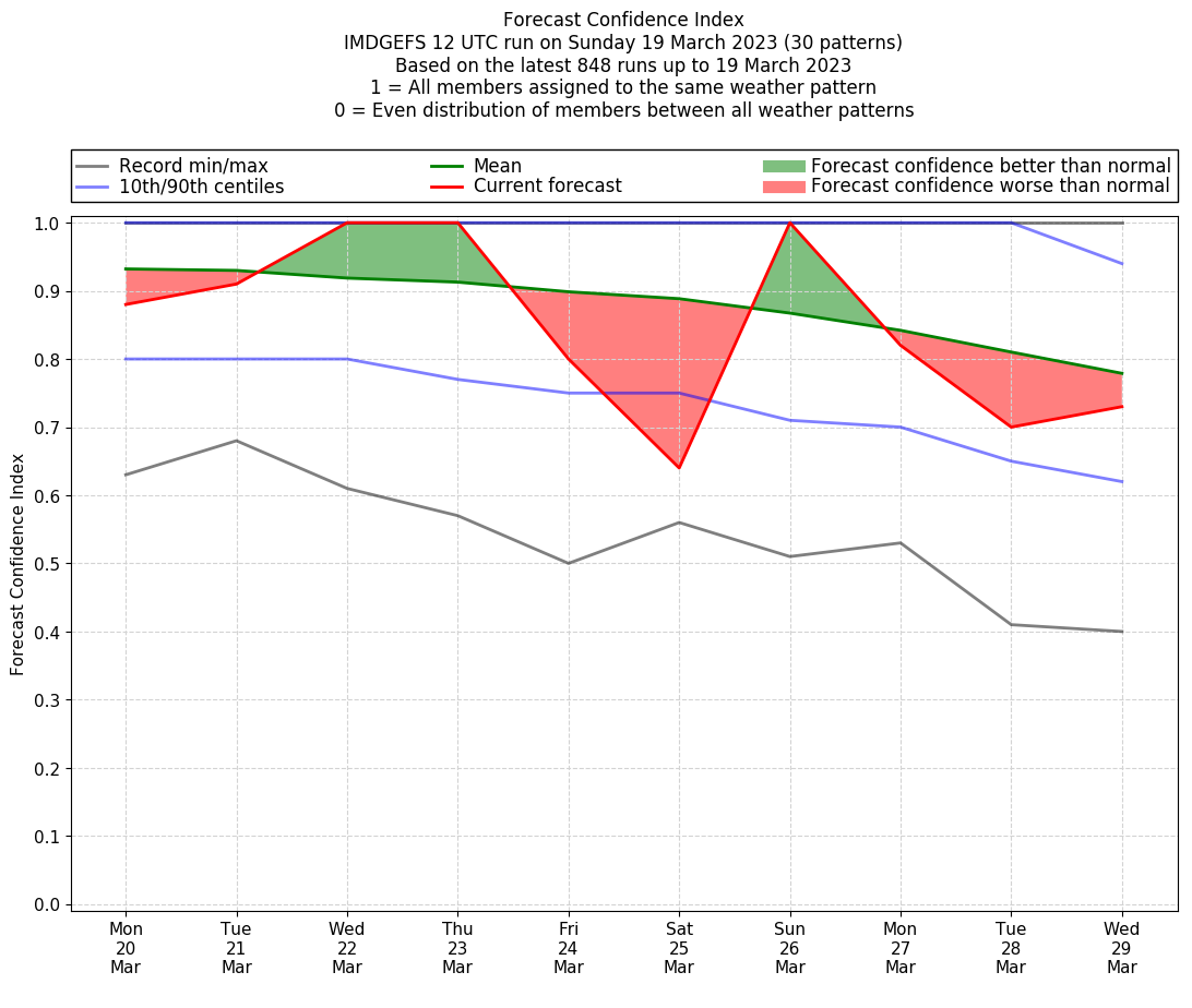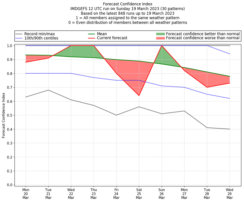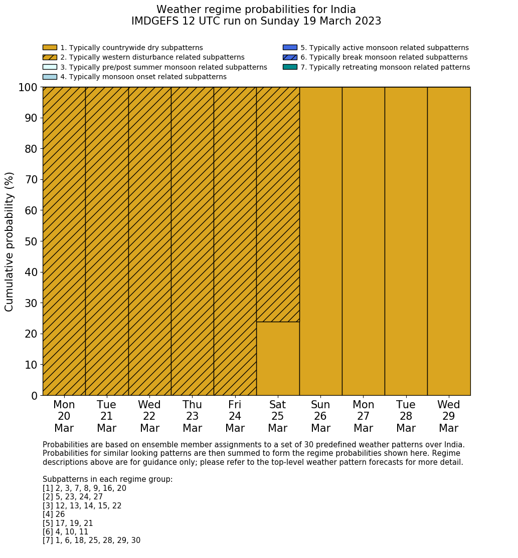 | Weather patterns typically associated with contrywide dry period tendencies over India are most likely Weather patterns 2, 3, 7, 8, 9, 16 and 20 (countrywide winter dry period) | |