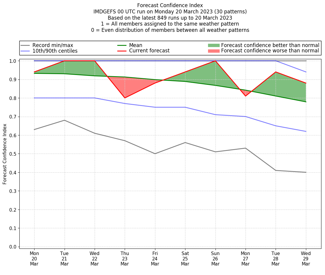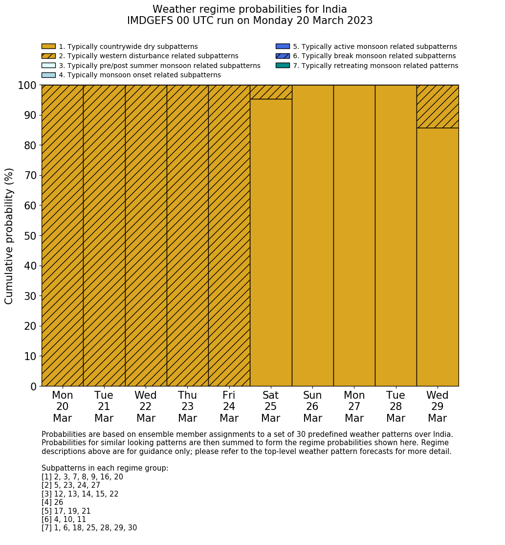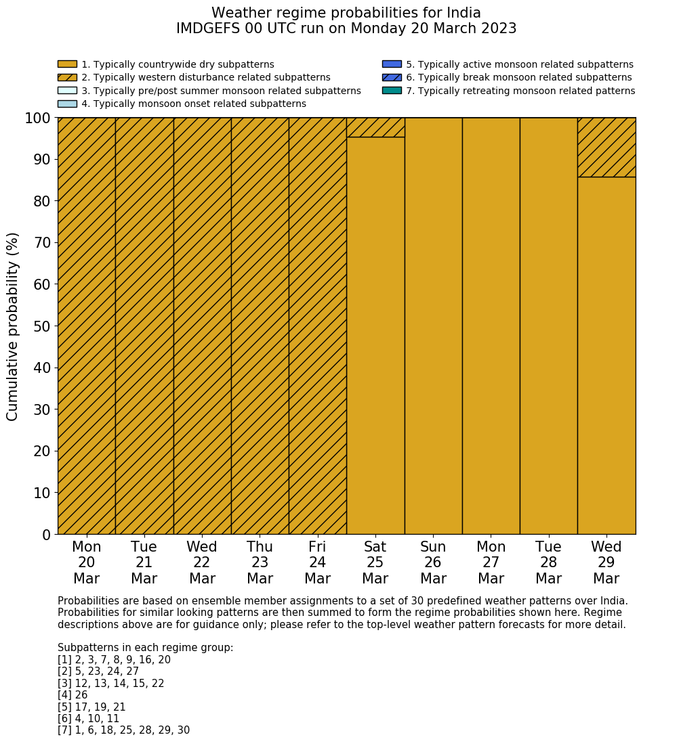 | Weather patterns typically associated with contrywide dry period tendencies over India are most likely Weather patterns 2, 3, 7, 8, 9, 16 and 20 (countrywide winter dry period) | |