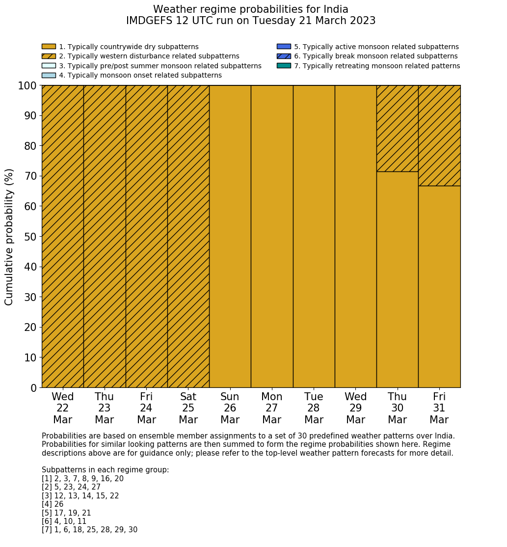 | Weather patterns typically associated with contrywide dry period tendencies over India are most likely Weather patterns 2, 3, 7, 8, 9, 16 and 20 (countrywide winter dry period) | |