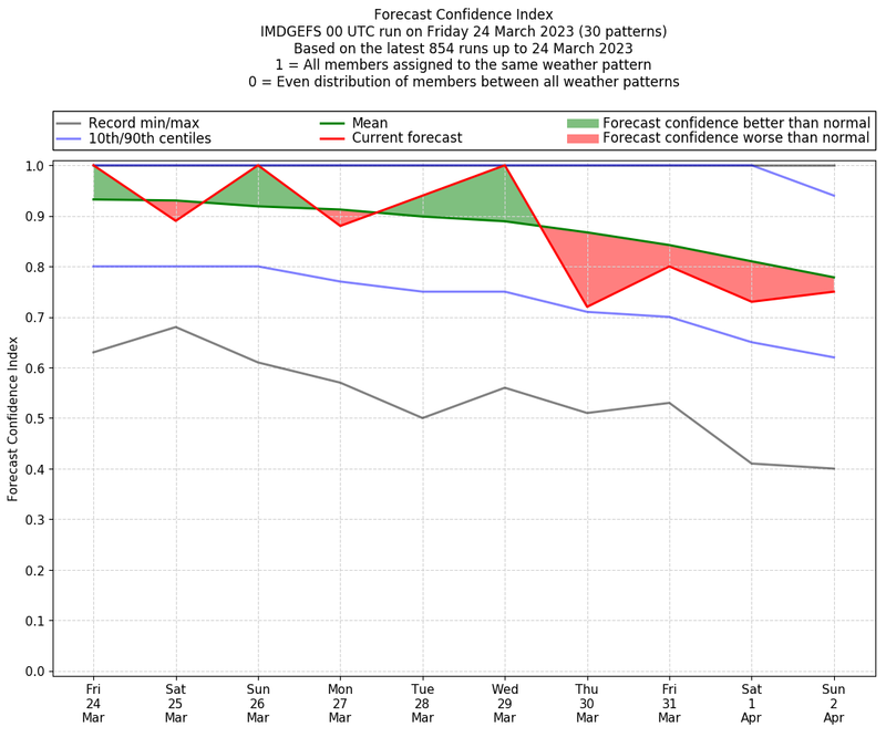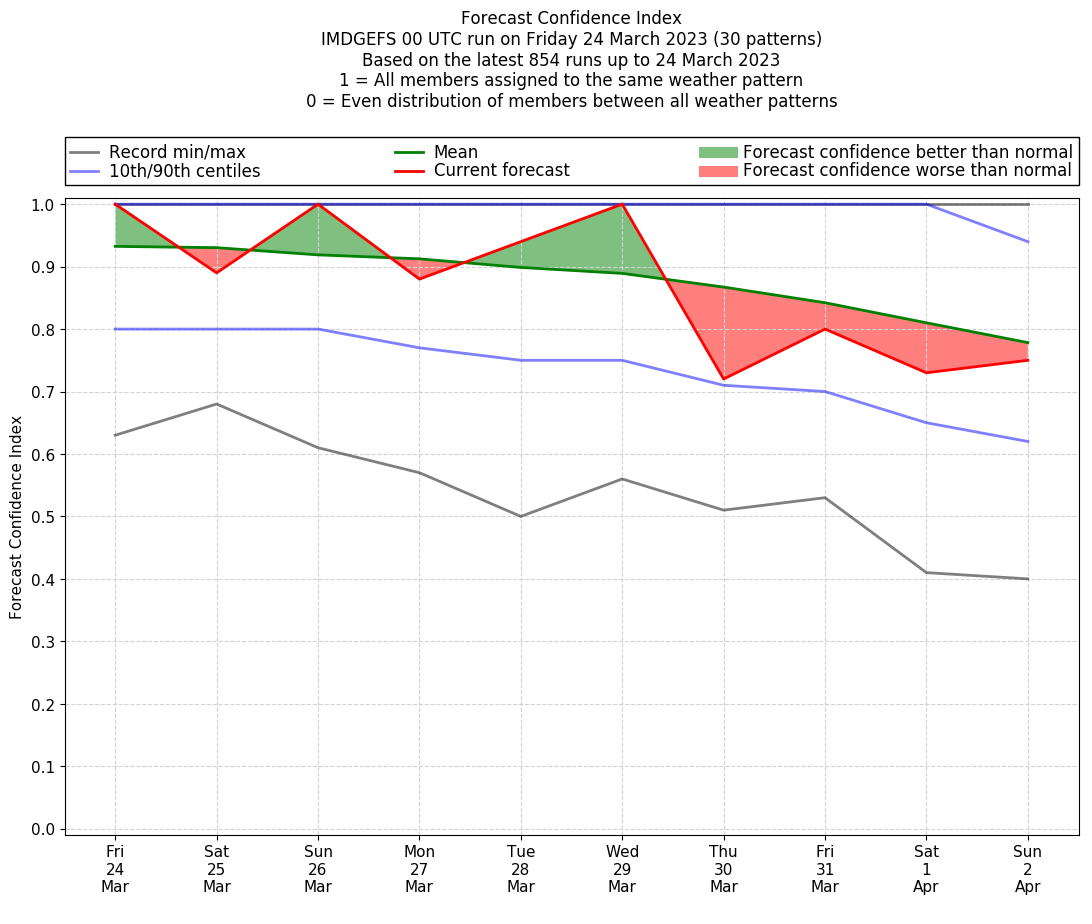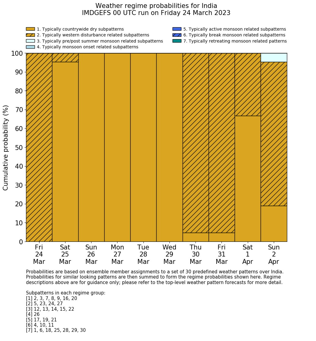 | Weather patterns typically associated with contrywide dry period tendencies over India are most likely Weather patterns 2, 3, 7, 8, 9, 16 and 20 (countrywide winter dry period) | |