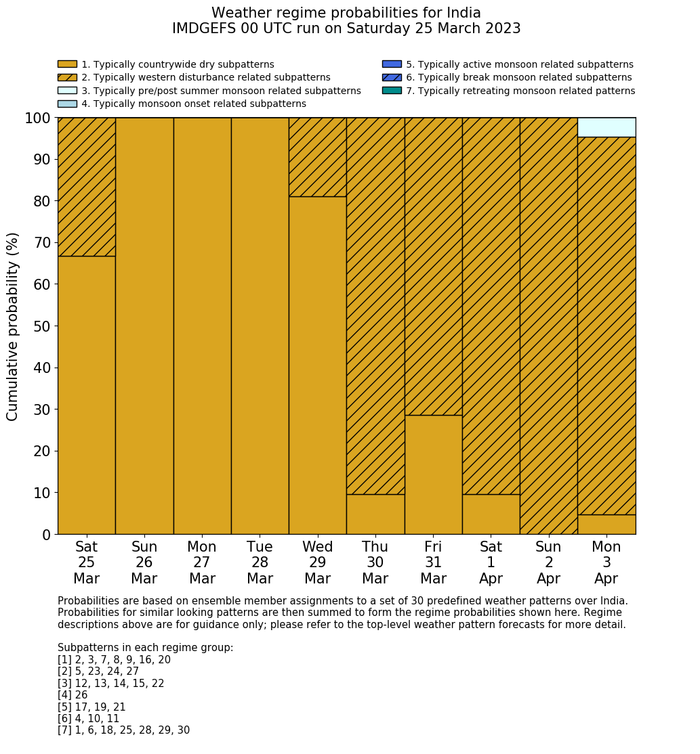 | Weather patterns typically associated with contrywide dry period tendencies over India are most likely Weather patterns 2, 3, 7, 8, 9, 16 and 20 (countrywide winter dry period) | |