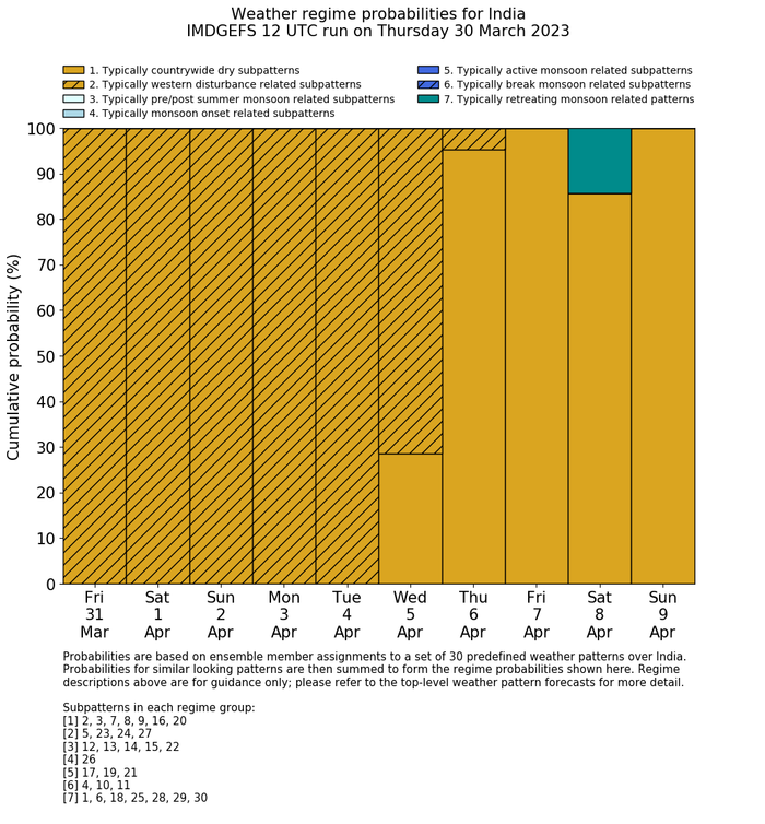 | Weather patterns typically associated with contrywide dry period tendencies over India are most likely Weather patterns 2, 3, 7, 8, 9, 16 and 20 (countrywide winter dry period) | |