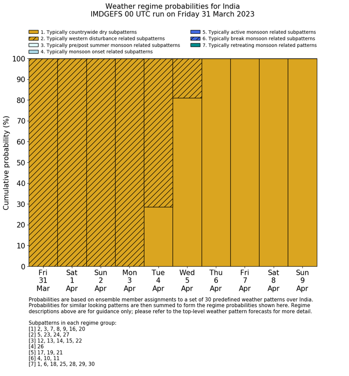 | Weather patterns typically associated with contrywide dry period tendencies over India are most likely Weather patterns 2, 3, 7, 8, 9, 16 and 20 (countrywide winter dry period) | |