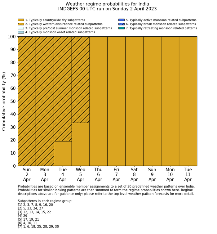 | Weather patterns typically associated with contrywide dry period tendencies over India are most likely Weather patterns 2, 3, 7, 8, 9, 16 and 20 (countrywide winter dry period) | |