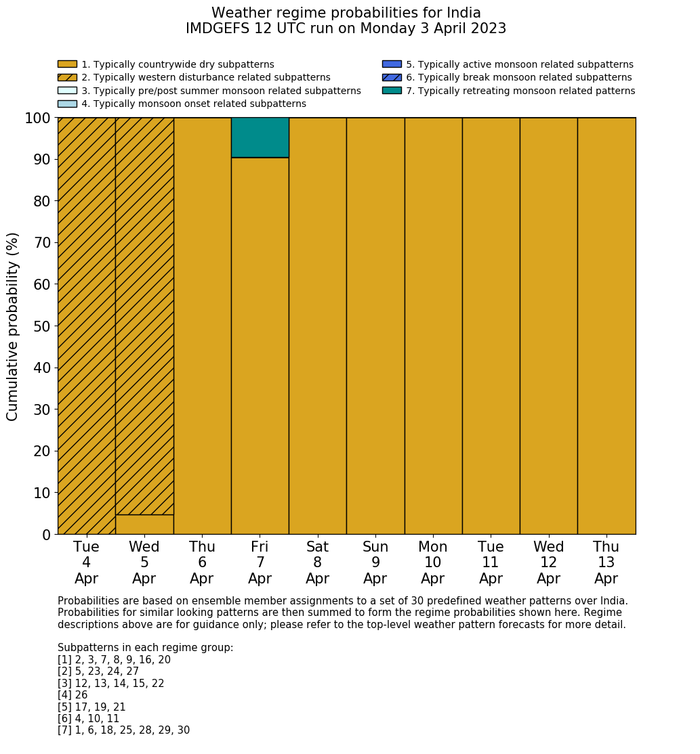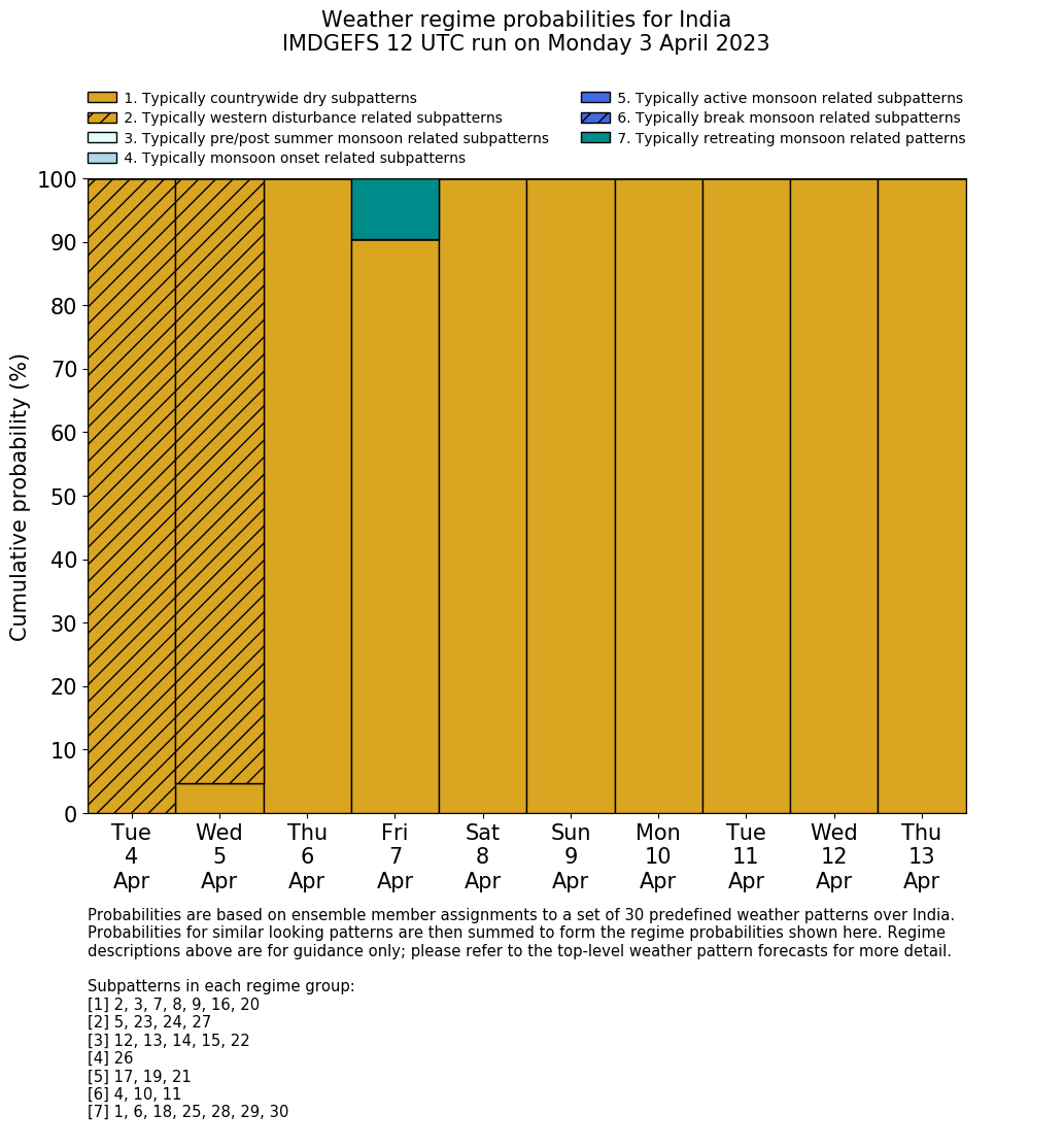 | Weather patterns typically associated with contrywide dry period tendencies over India are most likely Weather patterns 2, 3, 7, 8, 9, 16 and 20 (countrywide winter dry period) | |