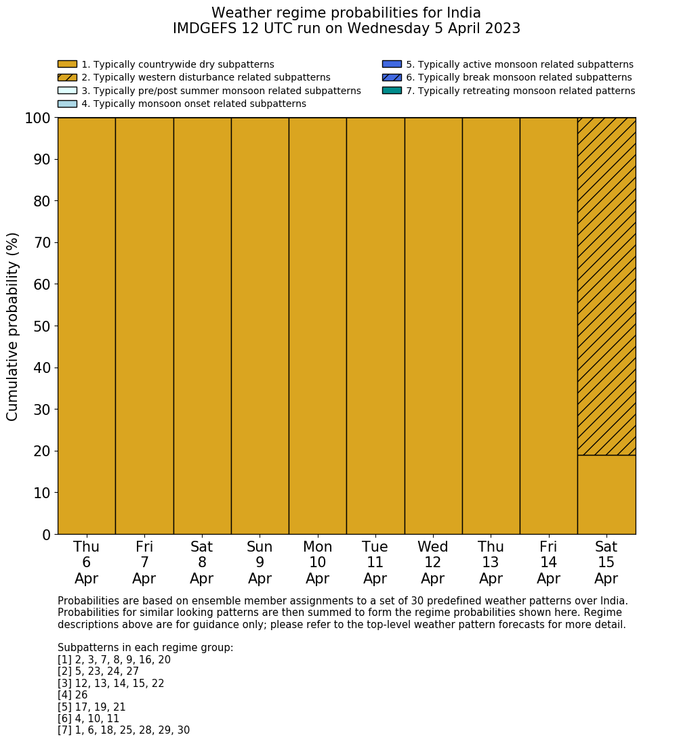 | Weather patterns typically associated with contrywide dry period tendencies over India are most likely Weather patterns 2, 3, 7, 8, 9, 16 and 20 (countrywide winter dry period) | |