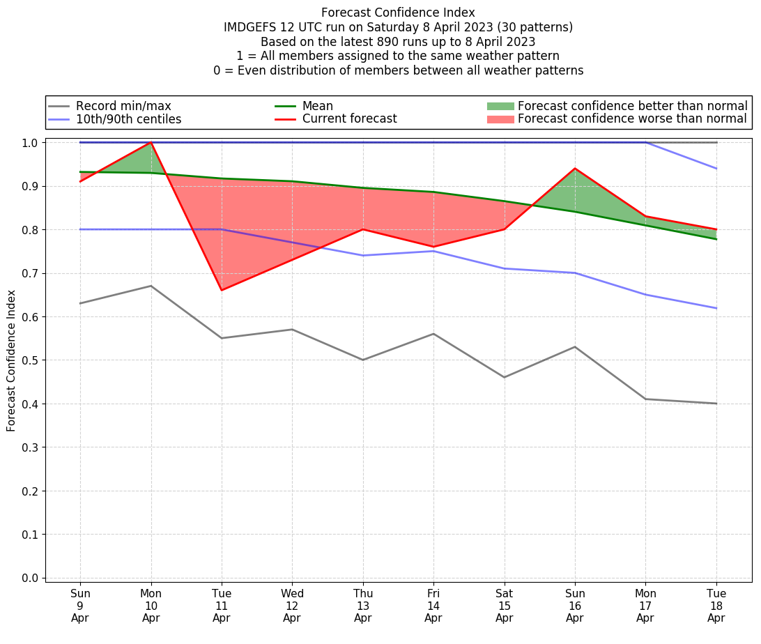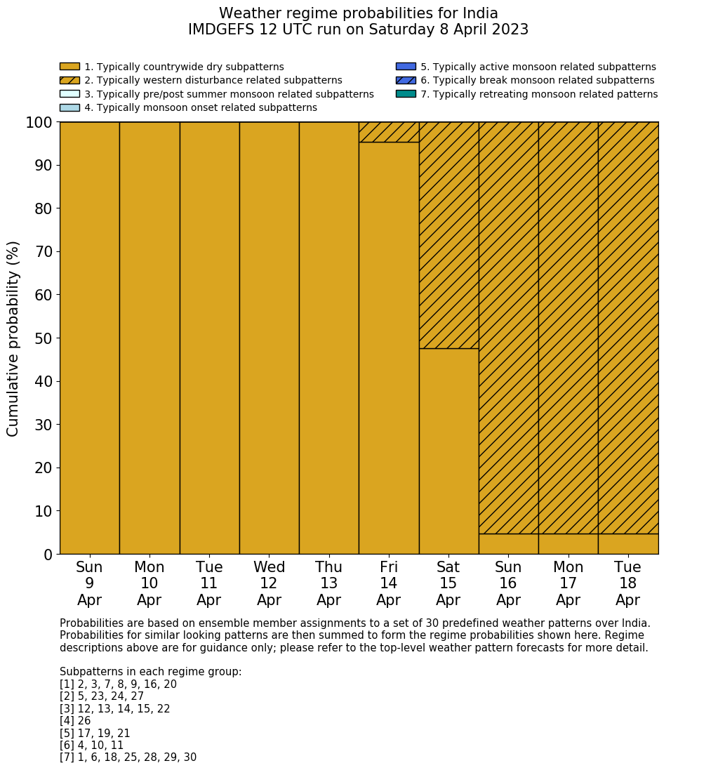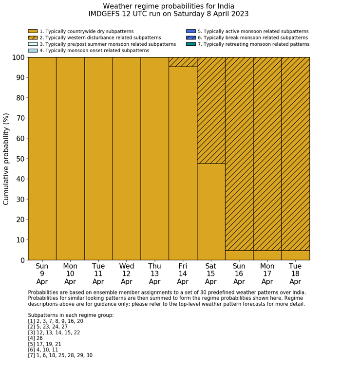 | Weather patterns typically associated with contrywide dry period tendencies over India are most likely Weather patterns 2, 3, 7, 8, 9, 16 and 20 (countrywide winter dry period) | |