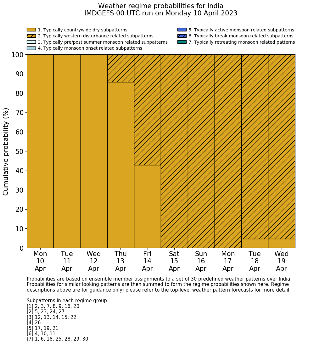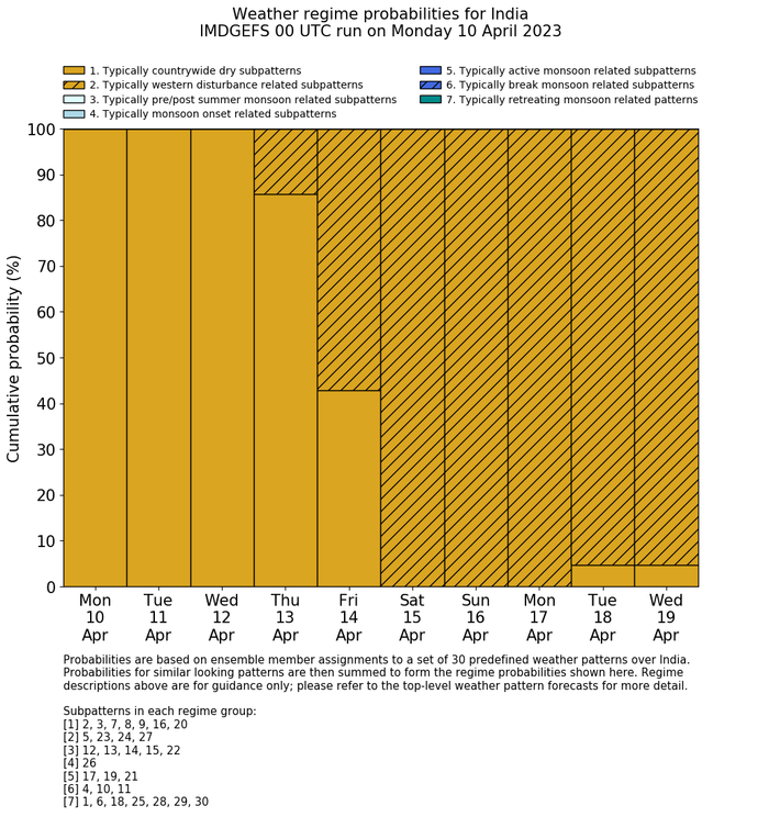 | Weather patterns typically associated with contrywide dry period tendencies over India are most likely Weather patterns 2, 3, 7, 8, 9, 16 and 20 (countrywide winter dry period) | |