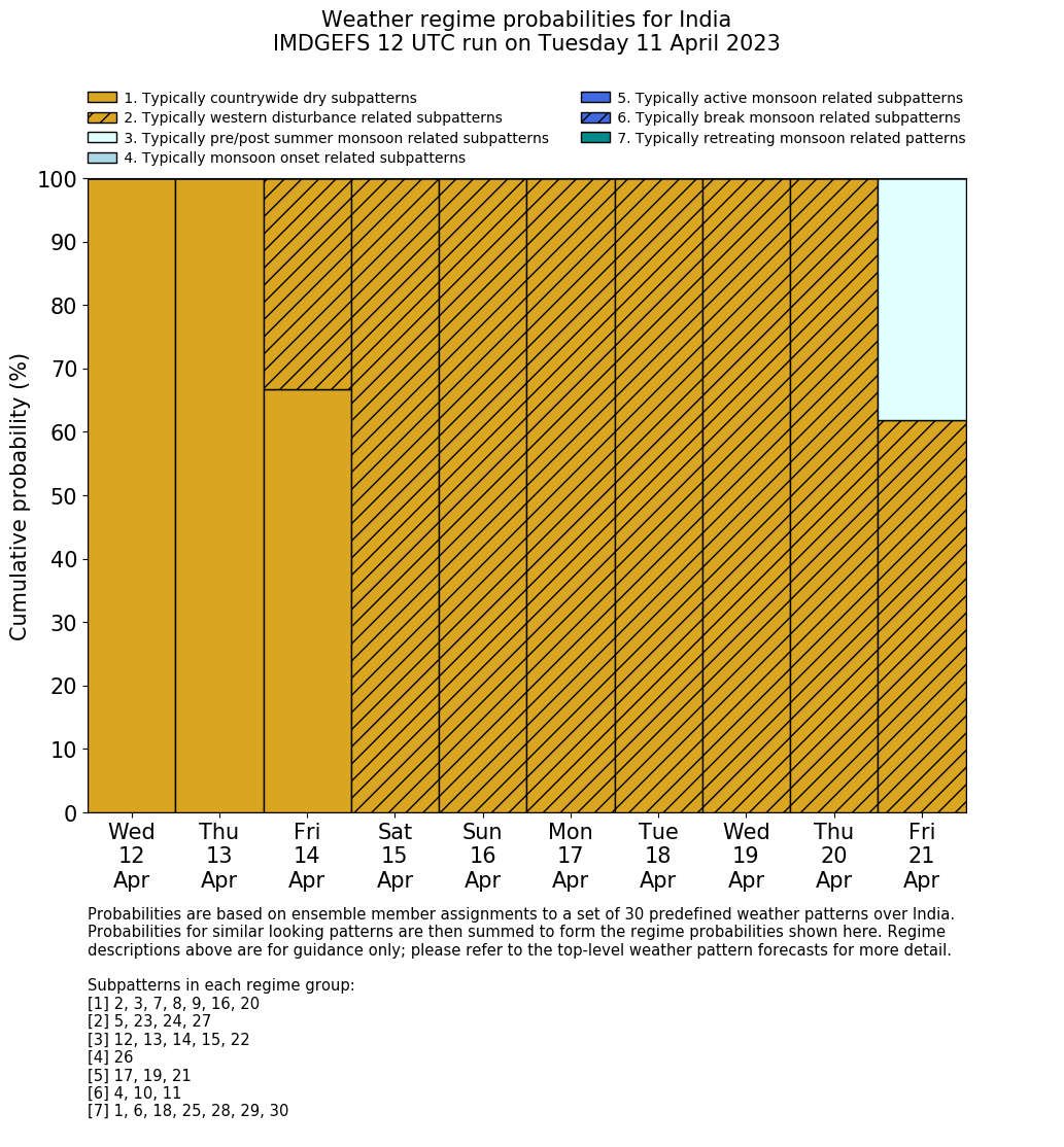| Weather patterns typically associated with contrywide dry period tendencies over India are most likely Weather patterns 2, 3, 7, 8, 9, 16 and 20 (countrywide winter dry period) | |