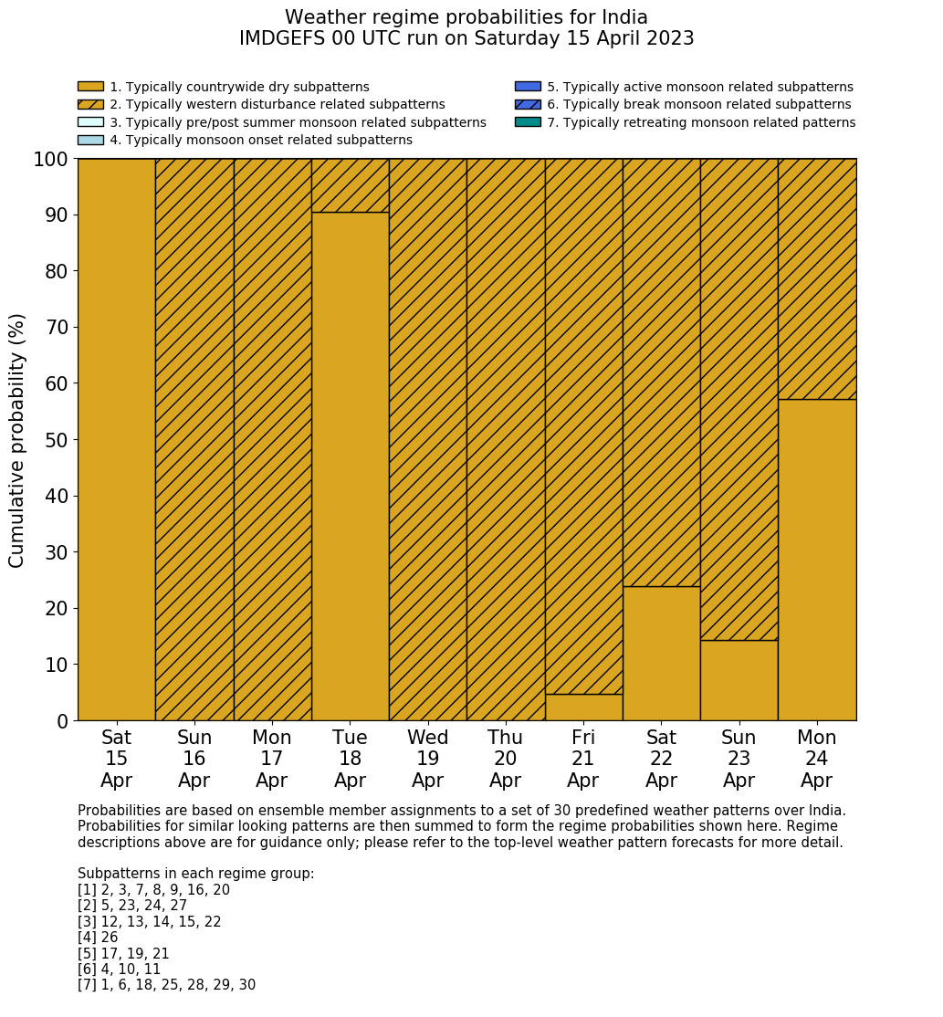 | Weather patterns typically associated with contrywide dry period tendencies over India are most likely Weather patterns 2, 3, 7, 8, 9, 16 and 20 (countrywide winter dry period) | |