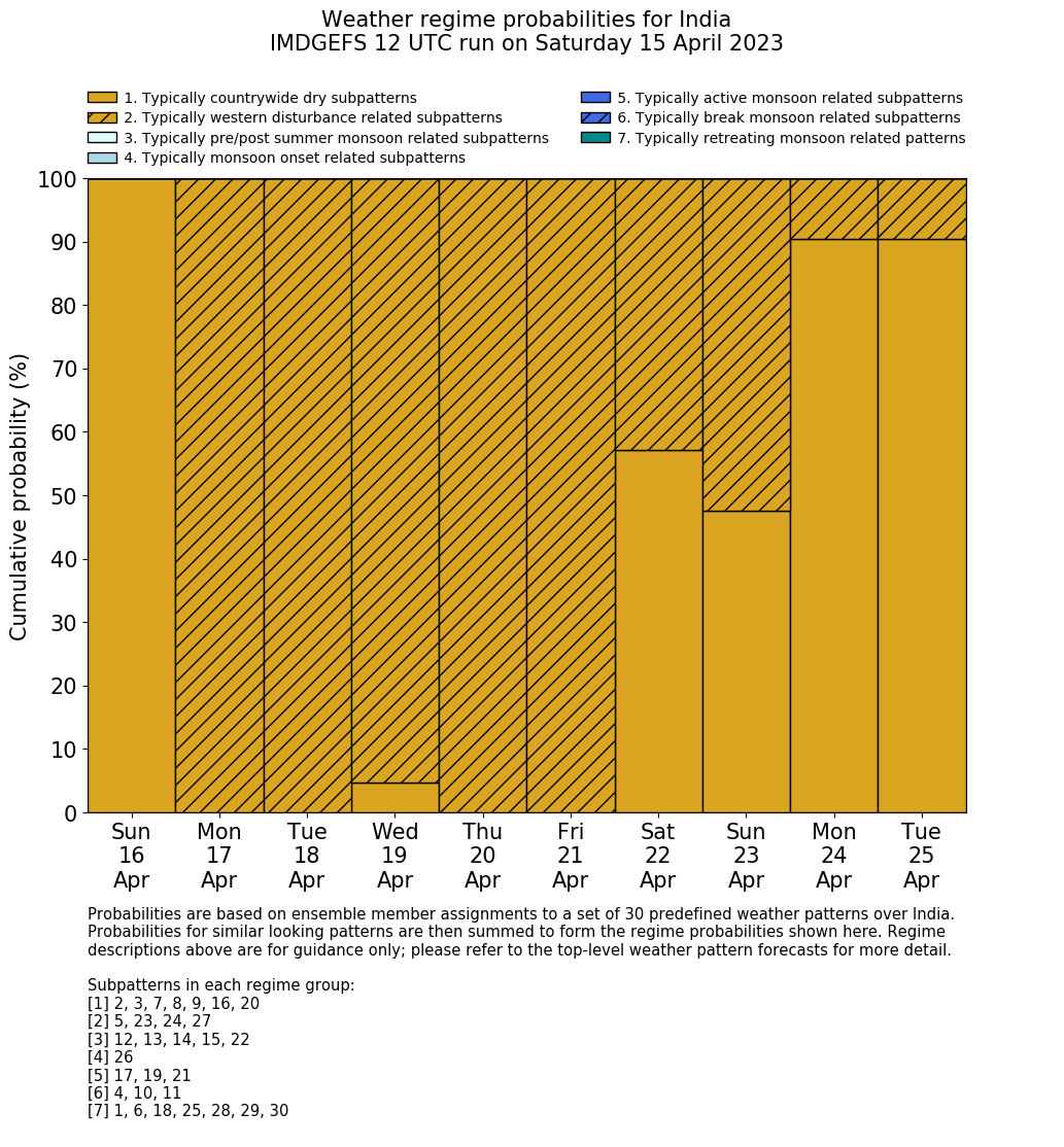 | Weather patterns typically associated with contrywide dry period tendencies over India are most likely Weather patterns 2, 3, 7, 8, 9, 16 and 20 (countrywide winter dry period) | |