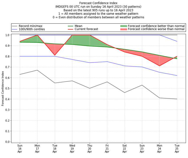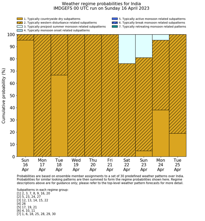 | Weather patterns typically associated with contrywide dry period tendencies over India are most likely Weather patterns 2, 3, 7, 8, 9, 16 and 20 (countrywide winter dry period) | |